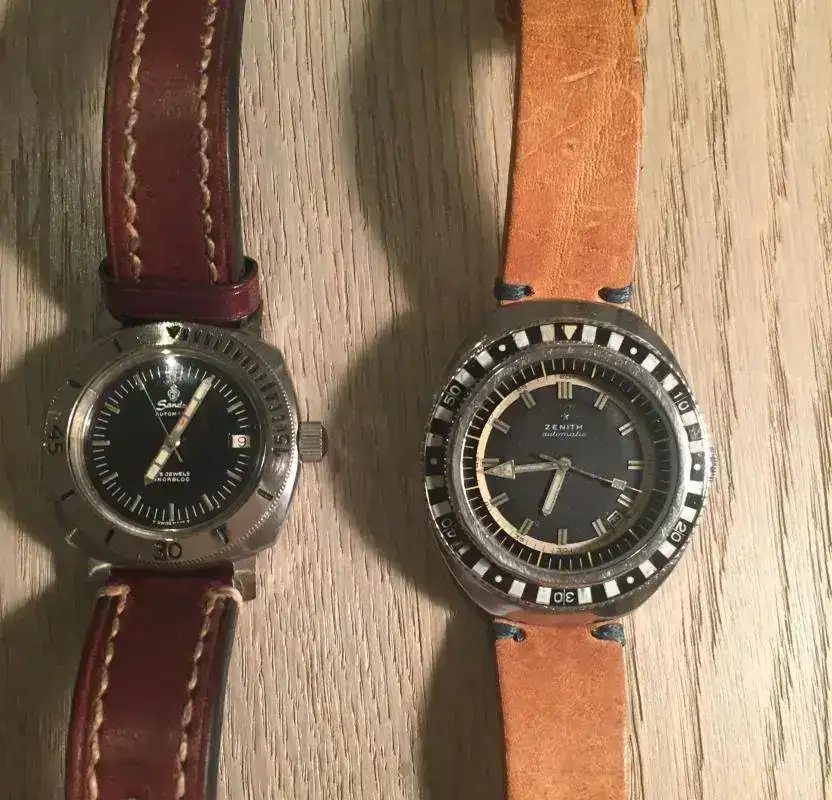 Zenith A3637 de 1970, comparte caja con otras muchas marcas y modelos, como el Blancpain 50 brazas "Barracuda", o el Zodiac Super Sea Wolf, pero curiosamente cada marca le clasificaba con una resistencia al agua diferente :500, 750 o 1000m.