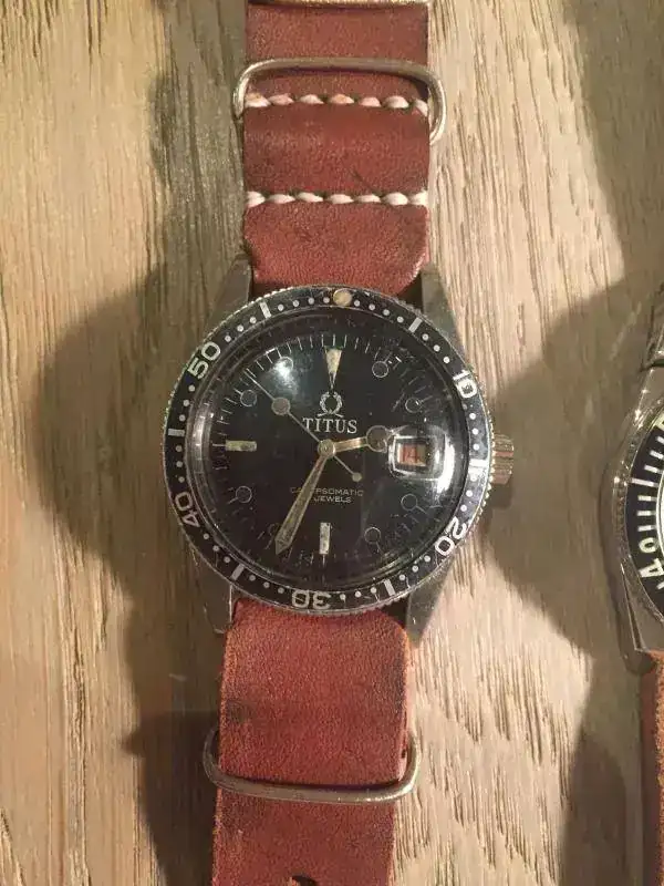 Empezamos con un Titus Calypsomatic 7085 de 1963, que en este caso lleva una NATO tipo Ammo Strap, es decir una correa fabricada con el cuero envejecido de las bolsas de municiones que empleaban antiguamente en los ejércitos. Este cuero esta muy reblandecido por el uso y su pátina es increíble. Creo que combina muy bien con el sufrido dial del emblemático Titus.