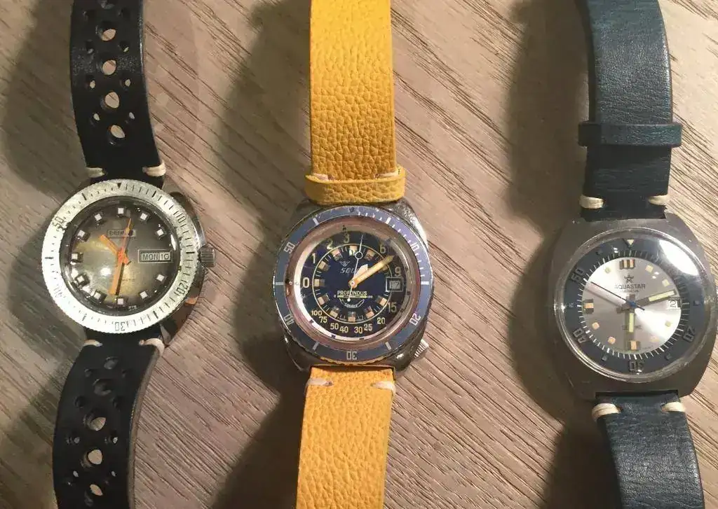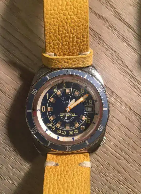 Sigue un curioso Squale Profondus Y535 de 1980, con Profundímetro mecánico, dial azul/blanco y bisel azul que combina perfectamente con un cuero amarillo con pespuntes blancos. Los primeros "Depth Gauge" o Reloj/profundímetros fueron los Nivada o Favre Leuba, seguidos por Helvetia, Dugena , Aquadive y este Squale.
