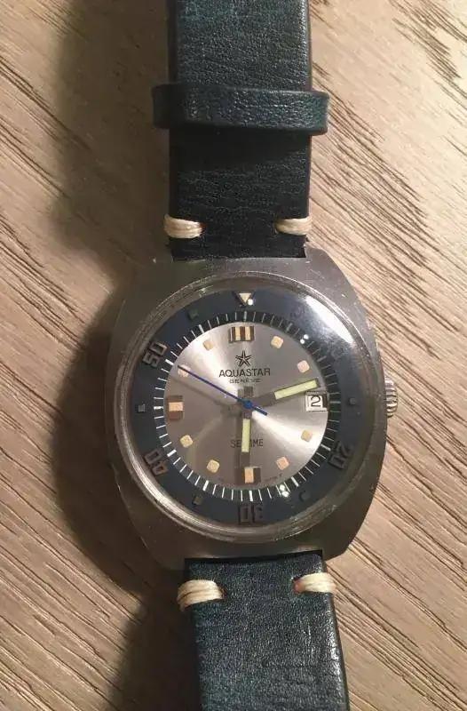 Aquastar Atoll (Atolón), un 200m de 1968-1970 que fue un reloj herramienta; como curiosidad decir que estaba incluido en el catálogo NEMROD de accesorios de buceo de 1970, y se uso en las primeras unidades experimentales de Buceo de la ARMADA ESPAÑOLA. Desde la creación en 1970 del CBA (Centro de Buceo de la Armada). Mi reloj lo he combinado con un cuero natural envejecido con un pespunte azul que da un poco de color al sobrio dial y bisel negros.