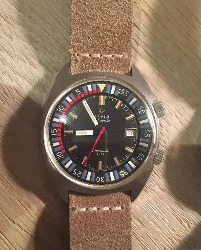 El primero, comparte caja con muchos relojes Super Compressor 42 mm de los años 70, este OLMA Caravelle destaca por su bisel interno con marcadores rojos de 20 minutos y blanco/gris alternos, la correa tipo serraje natural sin color añadido resalta precisamente esos colores del dial y aguja segundera. Un reloj de hace casi 50 años con una estética muy moderna. Es de esos relojes que todo el mundo pide verlos, porque llama la atención y no es fácil identificarlo.