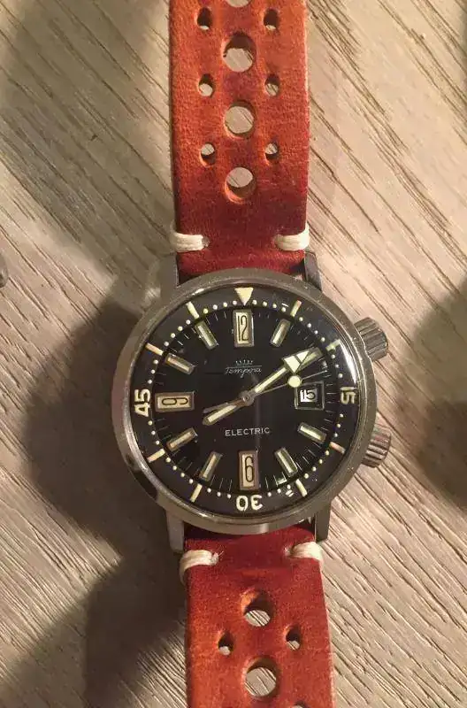 Sigue este Tempora-Electric/LIP Nautic-Ski con calibre Electromecánico Lip R184 de 1968. Sigue la estética de todos los Super Compressor de 38mm con dos coronas enormes, con la particularidad de ir dotado del novedoso calibre electromecánico. Como curiosidad, el nombre de Nautic-Ski es debido a que pese a ser un diver (Nautico), la hija del entonces propietario de la empresa, había sido miembro del equipo nacional de Ski en los años 50 y este reloj se presentó en los JJOO de Invierno de 1968. Aquí la correa es deportiva con orificios y de un color brandy.