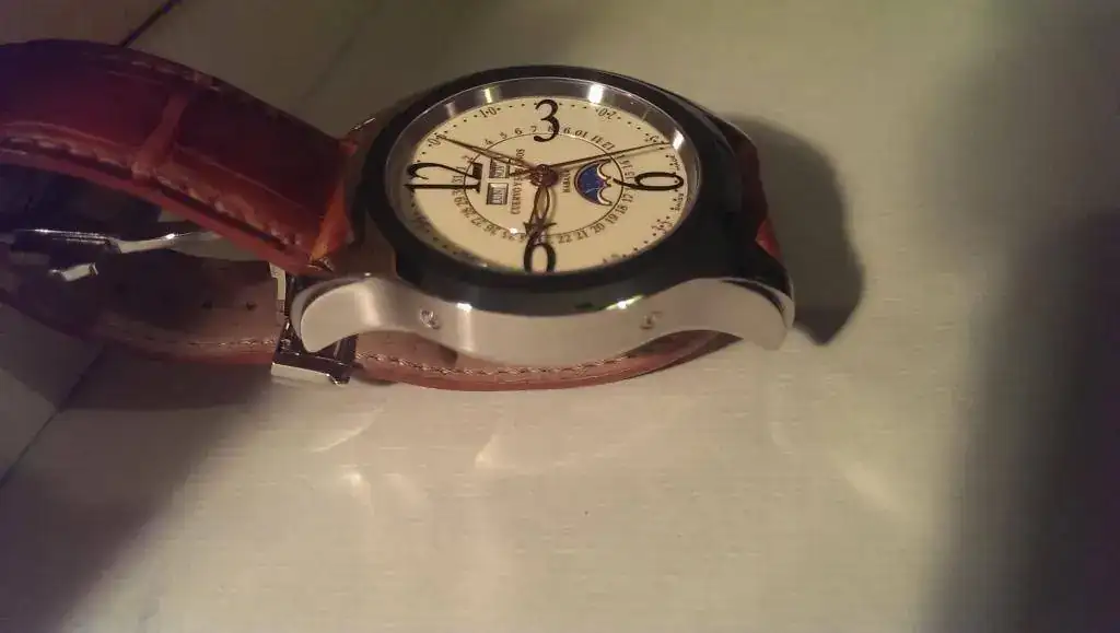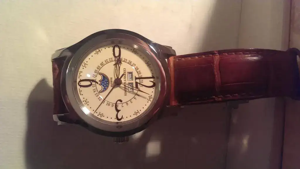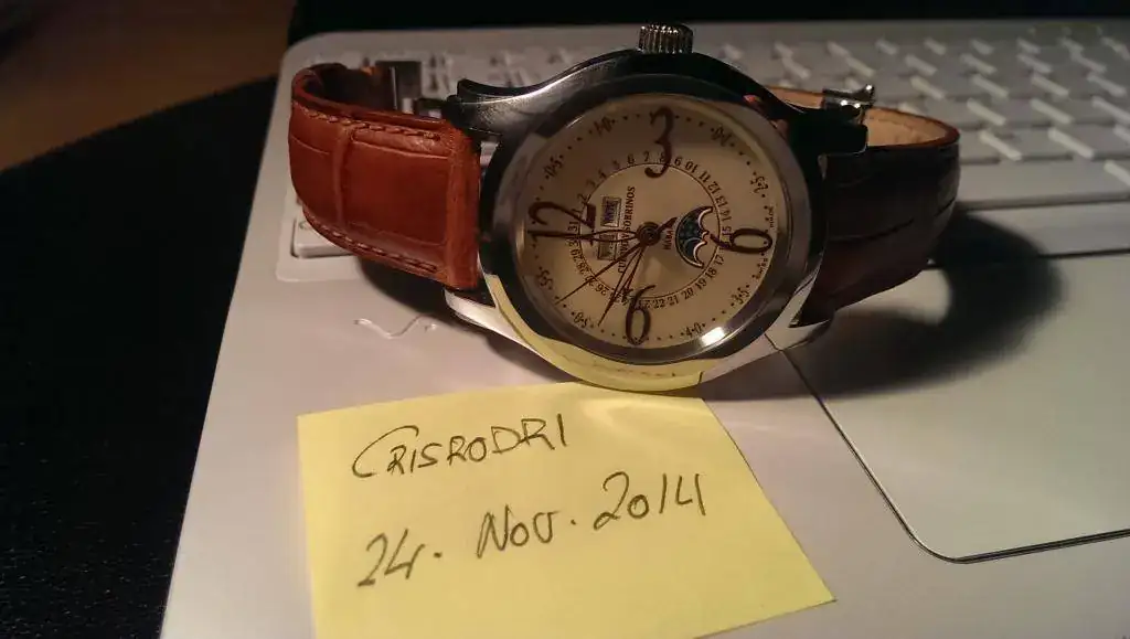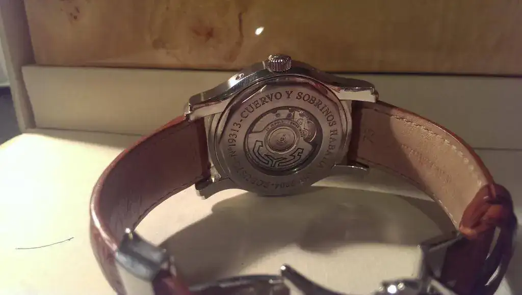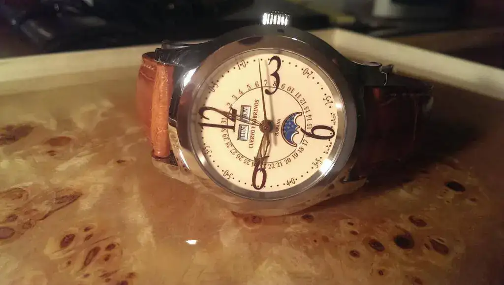 Pues vendo este modelo de Cuervo y Sobrinos muy bonito y dificil de ver por aquí, ya lo tuve hace un tiempo en venta pero nunca me decidí a vender, aunque estuve muy cerca de vederlo al final me arrepentí y se quedó conmigo. Se trata del modelo Robusto con función de triple calendario, dia, dia de la semana, mes y fase lunar (con cambio rapido para cada una de las funciones incluida la de fases lunares). Color de esfera espectacular en color marfil y agujas e indices en color marrón tabaco, colores muy típicos de la marca que le dotan de ese "sabor" especial con el contraste azulado de las fases lunares.
