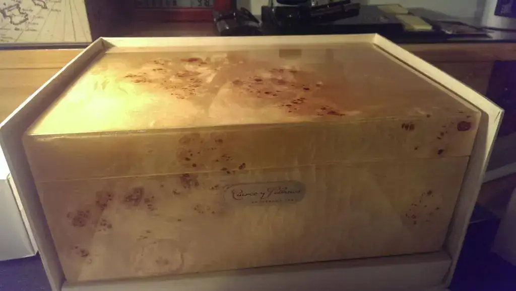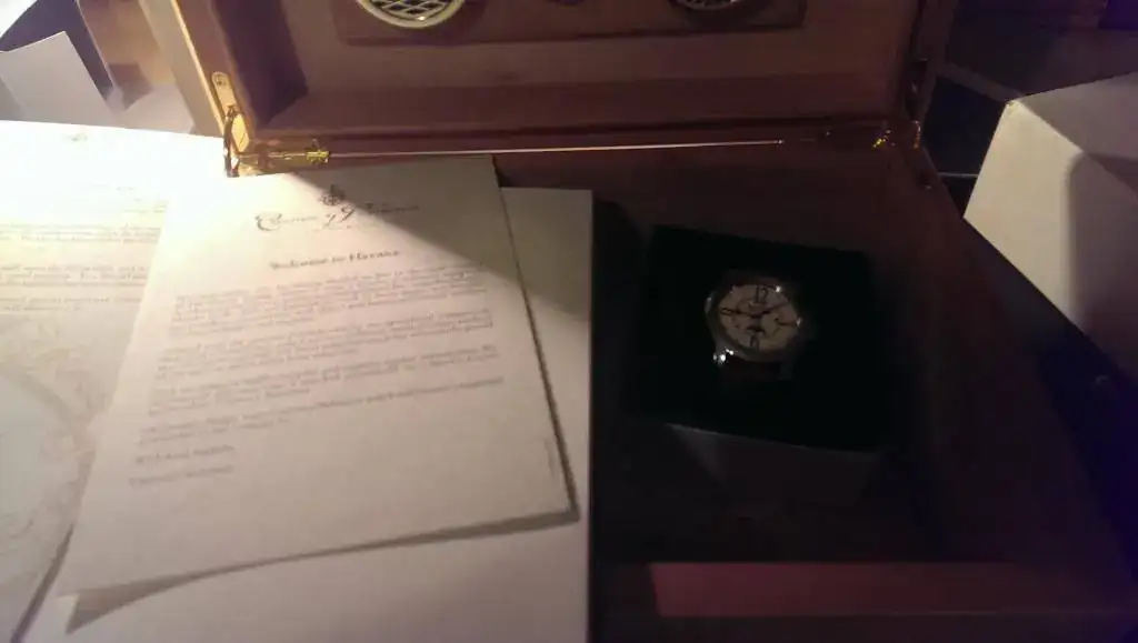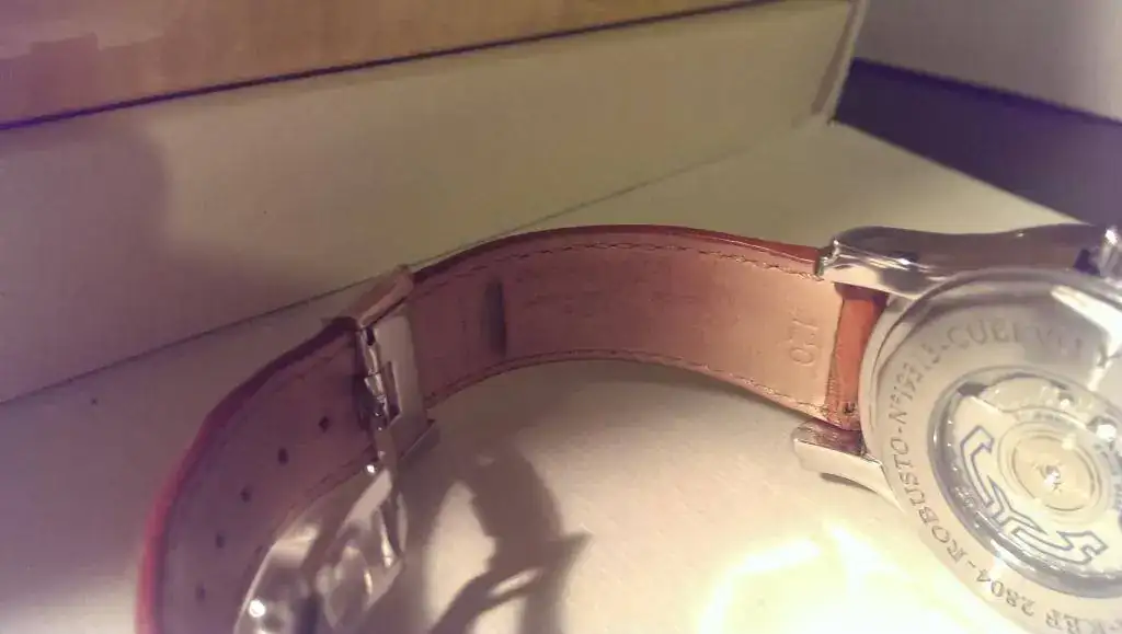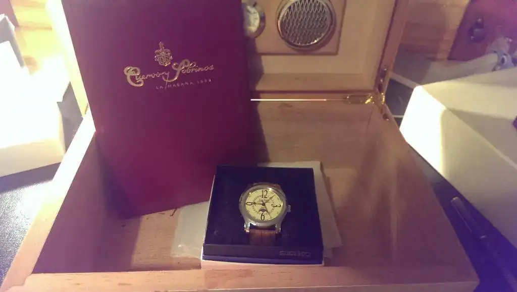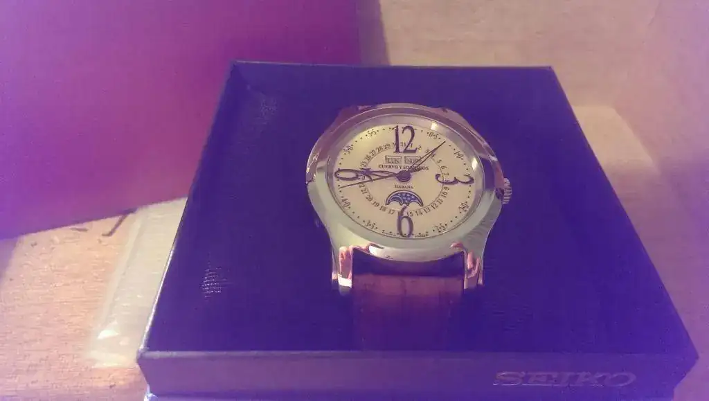 El reloj lo adquirí en el año 2010, desde entonces he sido único dueño, provenia de Concesionario oficial de Madrid. El estado del reloj es muy bueno, con los típicos pelillos de roces en la caja por su pulido a espejo en el frontal, en los laterales sin roces, ni grandes ni pequeños, sin golpes de ningún tipo. Cristal de zafiro impoluto y correa de cocodrilo en color miel usada y bien cuidada con crema especial, con vida por delante (tan sólo destaco en el interior la señal que produce el deplo en la correa cuando éste está guardado y cerrado sobre si mismo), cambie los pasadores porque los que traia de origen la correa me parecian poco seguros (esos que con un empujoncito salen solos). Entrego con caja exterior de cartón e interior en forma de humificador pero sin el soporte para el reloj que he estraviado junto con la garantia del reloj, acompaño una genérica para guardar el reloj de Seiko. Entrego con libro de Cuervo y Sobrinos y papeles del humificador.