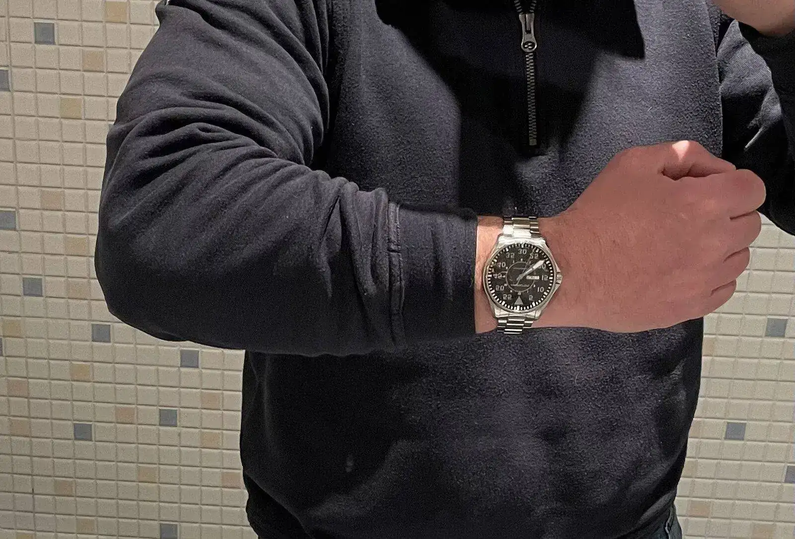 Hace tiempo que me dijo un amigo que para ver como te queda realmente un reloj tienes que fotografiar tu reflejo en el espejo y tenía razón, así es como realmente se ve la proporción.