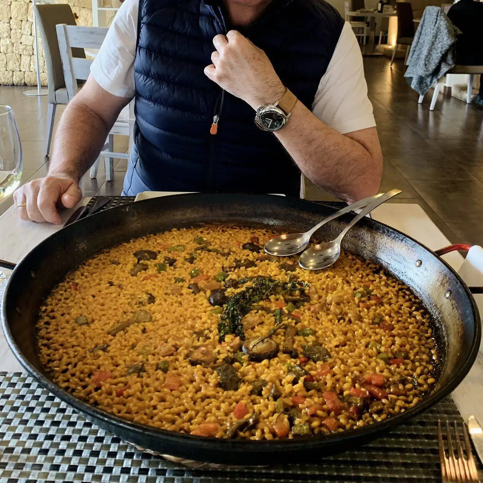 Paellera de 60 cm. y arroz para dos (mi mujer que es la que hace la foto y la tengo en frente) y un servidor,