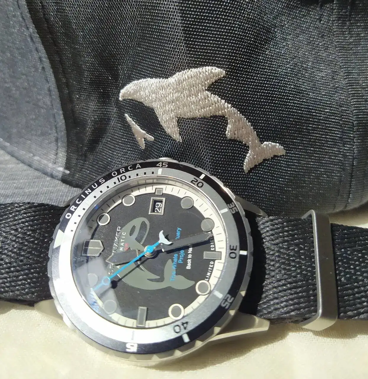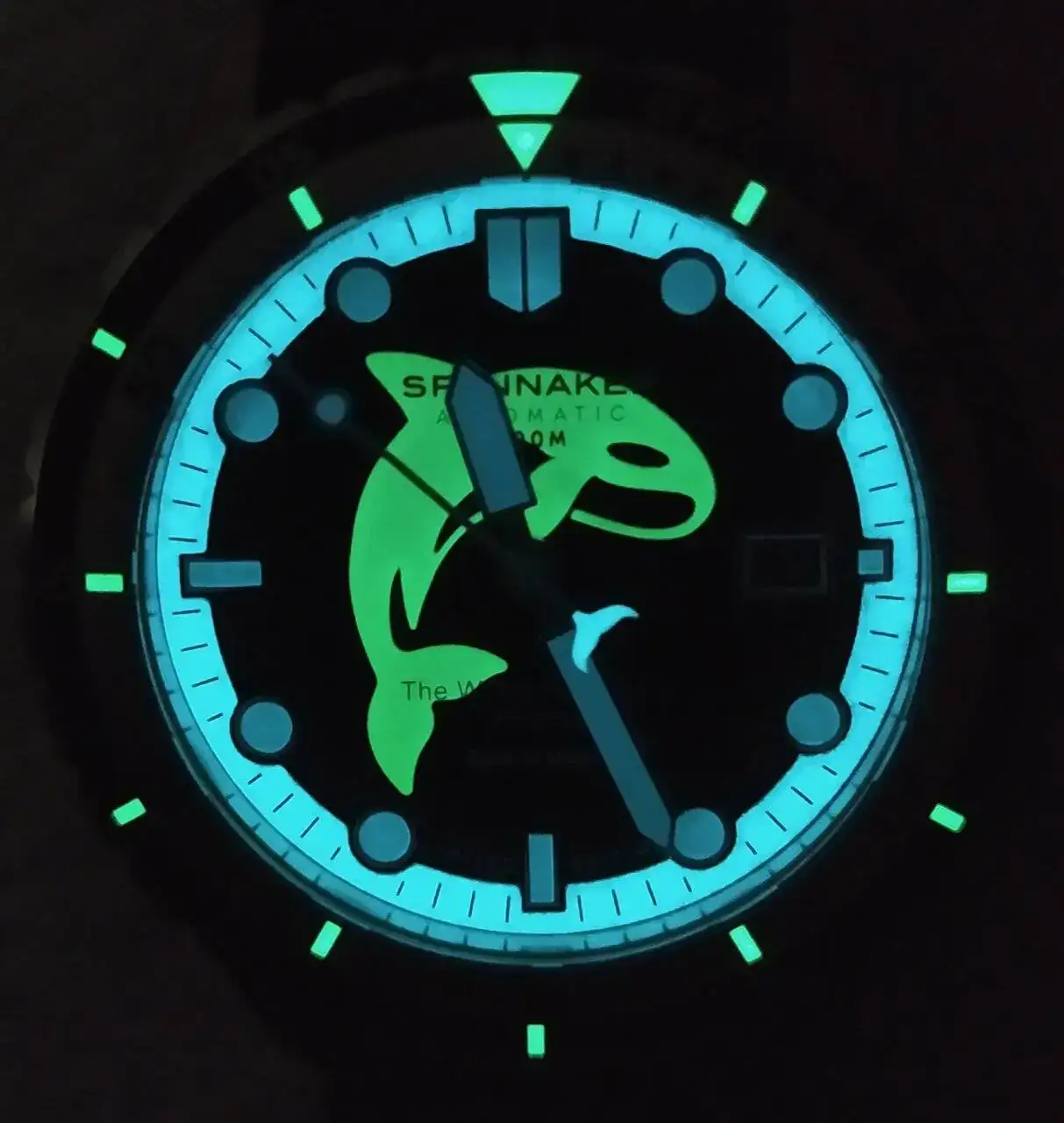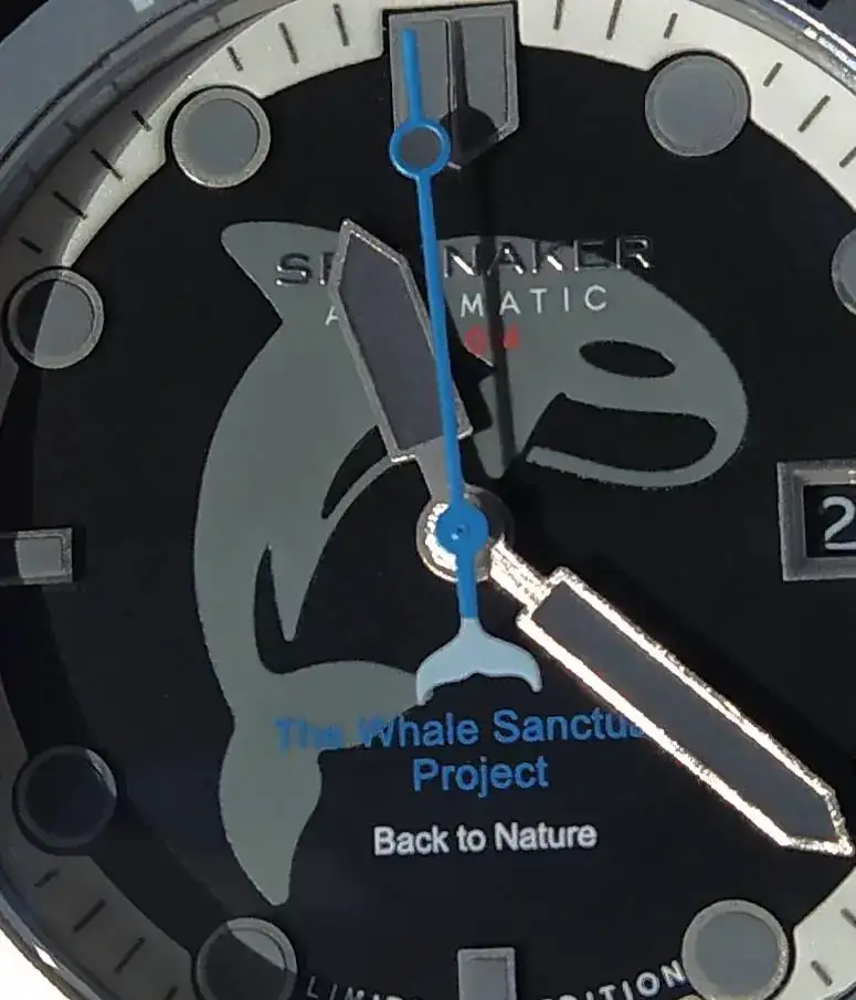 Ya sólo me queda hablaros del lumen. Combina dos tonos, el azul y el verde que contrastan sobre su esfera negra y que dejan ver en la oscuridad la silueta de la orca y la pequeña cola de ballena. Para mi es un pequeño espectáculo.
