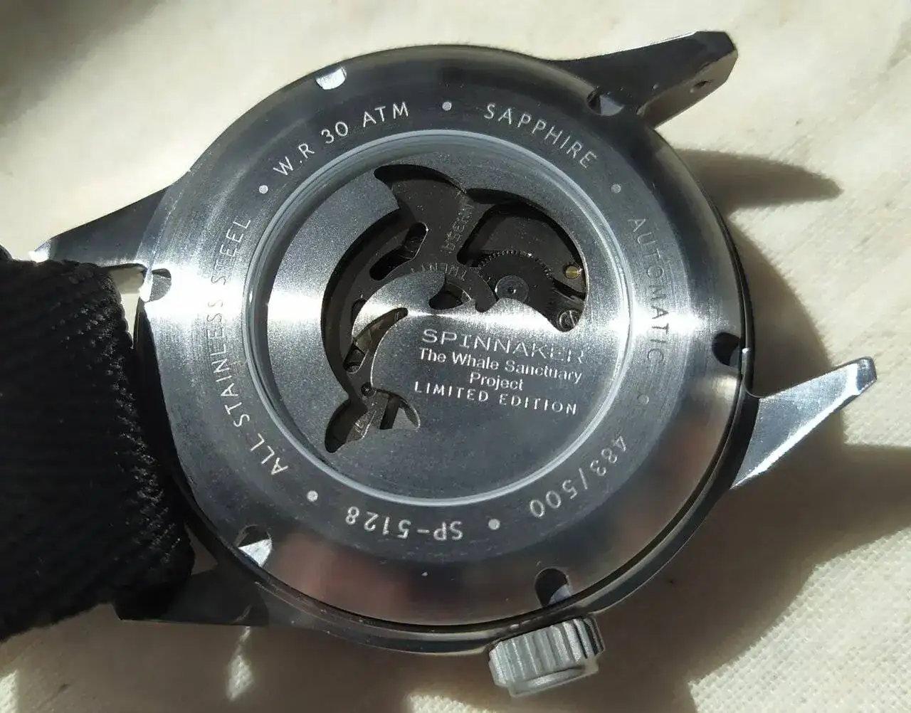 La tapa trasera deja ver a través de la silueta de la orca un sencillo calibre seiko conocido por todos, el nh35.