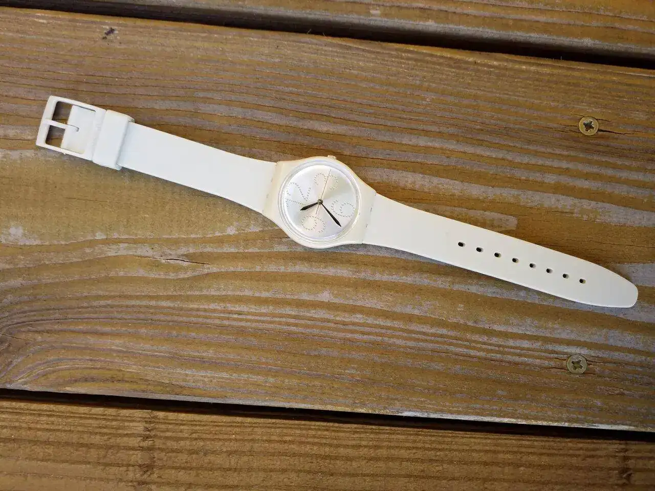 Un Swatch de mi hija. No lo usa por que hace mucho ruido. Fue un regalo que me hicieron por comprar el Tissot en el aeropuerto de Dubai. Se ha usado muy poco, pero al ser de mi niña, está con los mayores...