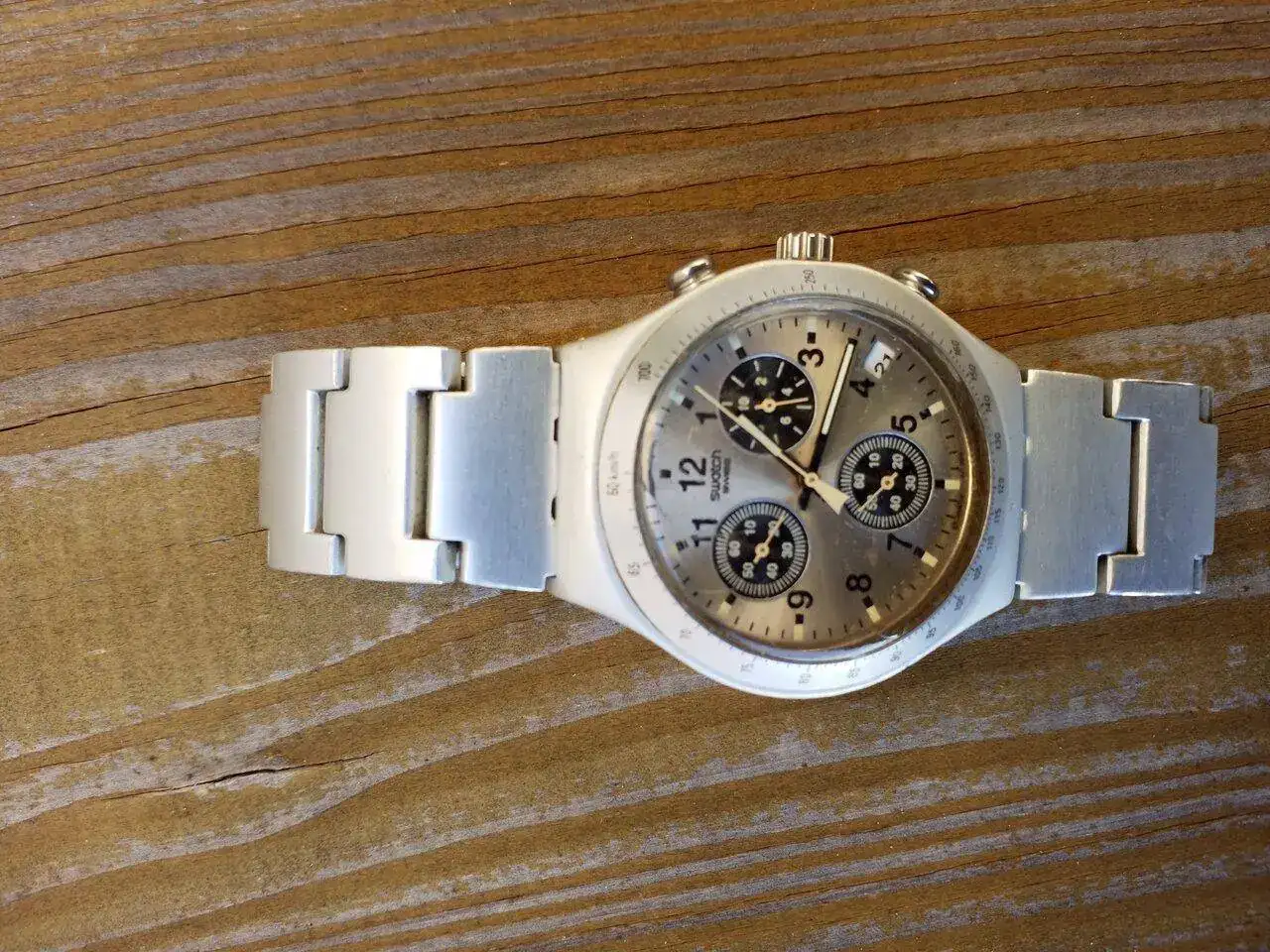 Un Swatch chrono no entero, con mucho valor para mi, ya que es de mi hermano. Ahora está sin pilas, la aguja del chrono no clava a las 12,... Tiene mucha guerra detrás pero no saldrá nunca de la caja.