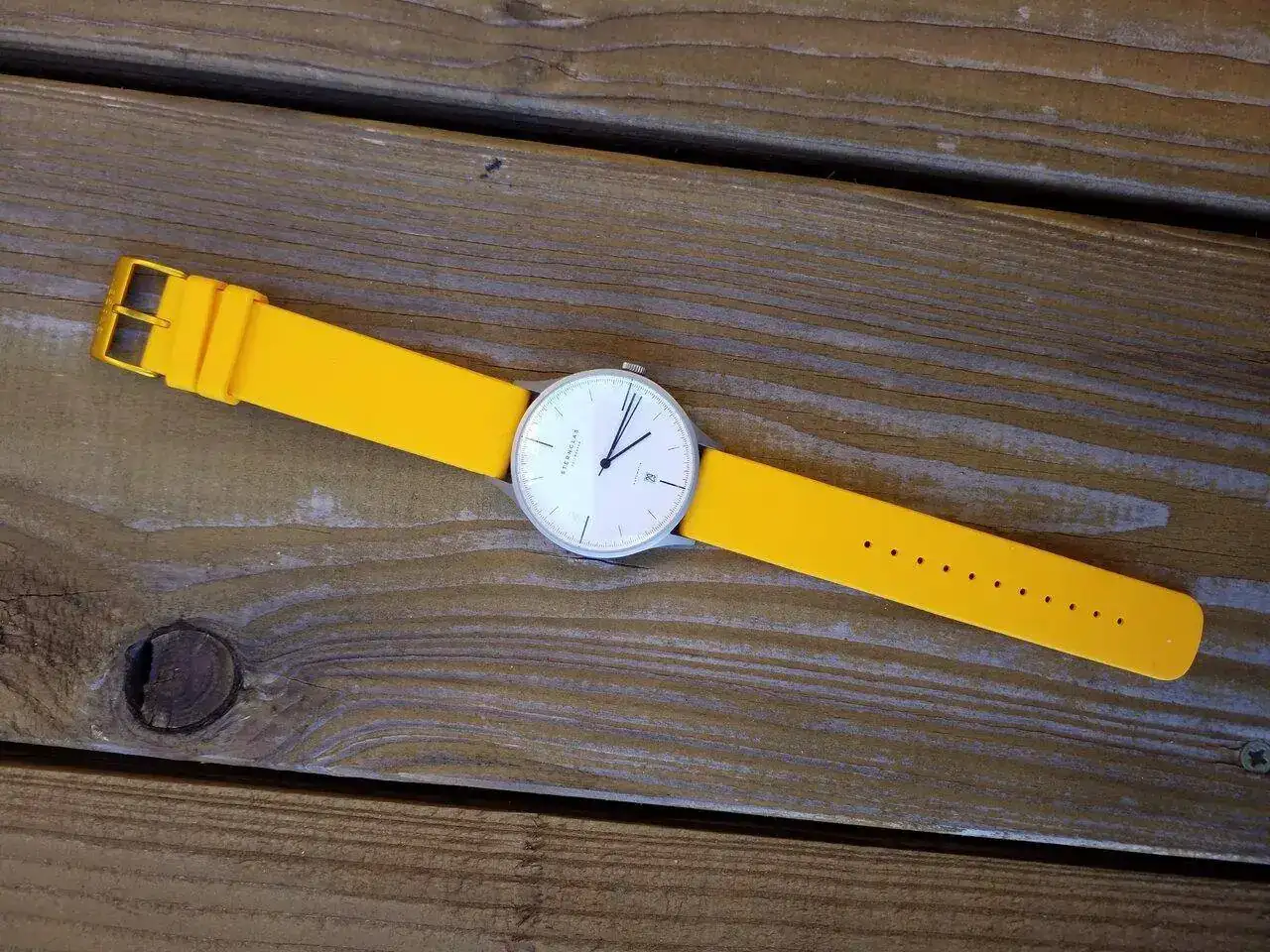 Un Sternglas Asthet, de otra micromarca. Me gusta mucho la estética bauhaus, simple y práctica. Con sus correas originales era demasiado serio y no cuadra con mi forma de vestir, por lo que le puse esa correa amarilla y es un reloj ideal en verano. El único mío que lleva un Miyota. El San Martín de mi hija también lleva uno. Funcionan bastante bien, no puedo quejarme.