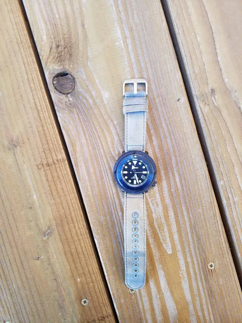 El primer y único solar de momento del grupo. Un Seiko Baby Tuna. Como se puede ver, su correa de silicona no es santo de mi devoción, y lo tengo guardado con una canvas de Archer que pide la jubilación a gritos... Sale poquito, la verdad, pero me gusta la caja. Supongo que algún día haré entrar un Tuna automático.