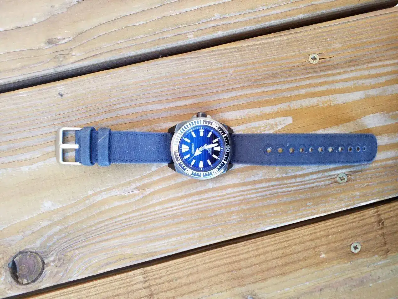 Y el siguiente es el culpable de que el Baby Tuna no salga... Un Seiko Samurai Save the ocean. La esfera me vuelve loco, la correa de silicona no tanto... Es grande y pesado, pero no se siente nada mal en la muñeca. Uno de mis favoritos.