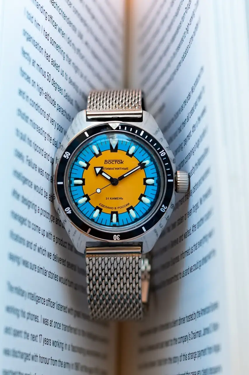 VOSTOK RE SE I. El Bananosky. Tremendo reloj, siempre que me lo pongo cosecha halagos. Proyecto del subforo ruso, antes de la terrible y actual guerra. Me apunté un poco asustado, con dudas... Y aprendí que hay mucho talento en los foreros, tanto en diseño como en organización. Luego me apunté en todos y cada uno de los proyectos del subforo ruso. Una maravilla de reloj.