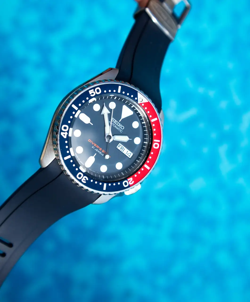 SEIKO SKX009J. Modelo mítico de la marca nipona. Lo compré cuando aún se fabricaba y era “raro” que te pararan un paquete en aduanas. Aquí disfrutando de un día de piscina con un caucho Crafter blue.