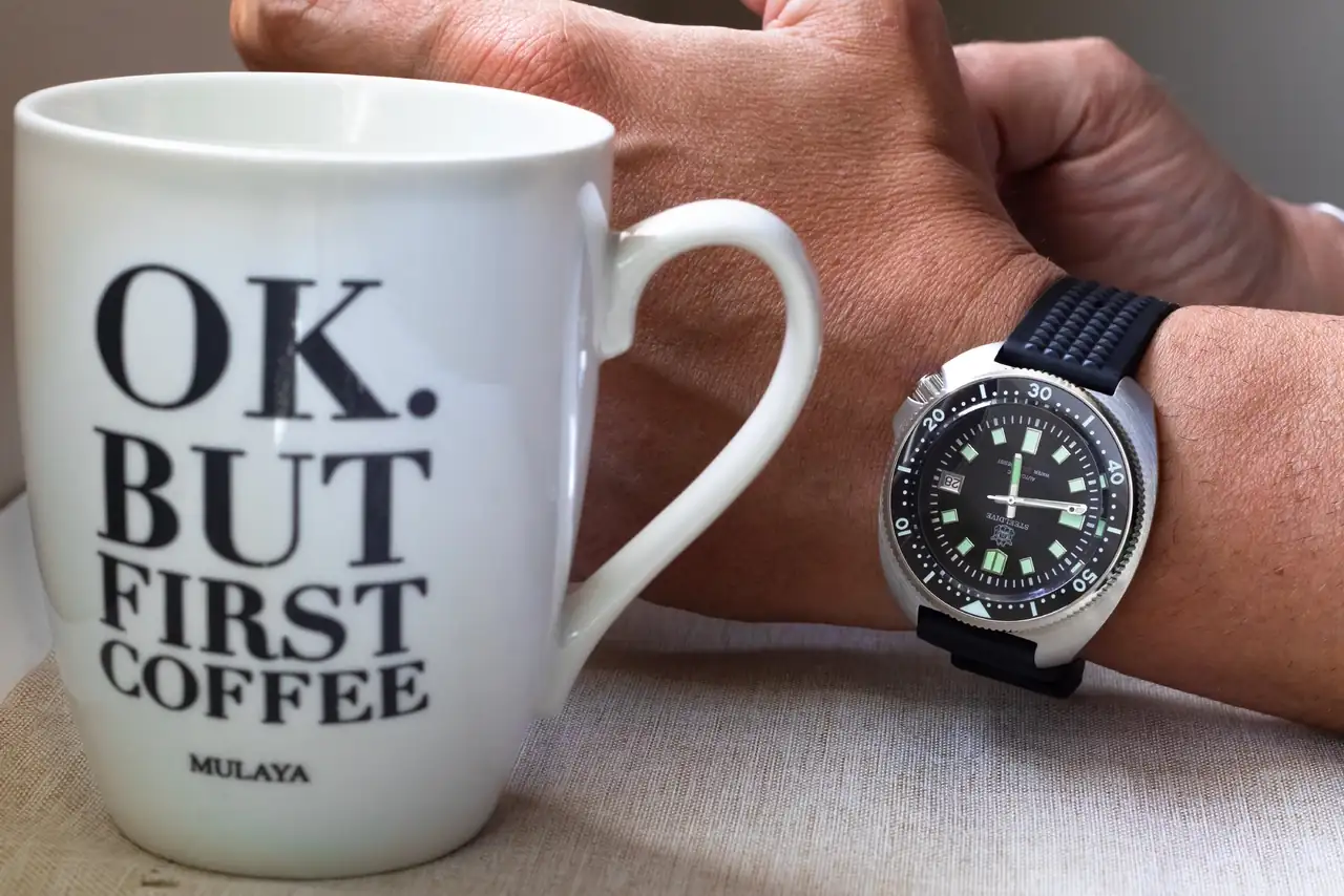 Y por último, este humilde Steeldive 1970. Homenaje al Seiko Capitan Willard. Le llamo "El reloj de la discordia" ( o no). Reloj que siempre me gustó, así como la película Apocalypse Now. La he visto muchas veces. Siempre que se ha hecho alguna reedición en algún foro, o salía alguna marca que homenajeaba al original, llegaba tarde a la cita y nunca me hacía con uno. Fui a por una de las reediciones actuales que ha sacado Seiko pero la versión que buscaba estaba agotada. No buscaba el Seiko Willard “normal-negro”, sino el gris con dial texturizado y correa nato verde-marrón. No me ha sido posible conseguirlo. Así fue como, un día me dije: a tomar viento, me compro el de Aliexpress para "ir tirando" a ver si consigo el de Seiko. Así que aprovechando uno de esos períodos de rebajas que tienen cada tanto, hace poco más de un mes, lo compré. Me llegó a los pocos días, le quité el armis que traía "ipso facto". Ni siquiera llegué a ajustarlo. Lo quité apenas llegó, no por nada en contra del brazalete que trae, no parece malo en absoluto. El tema es que yo lo quería con la correa de caucho tipo waffle como el de la película de Francis Ford Coppola. Así que me compré la correa en CNS Straps y así lo llevo.