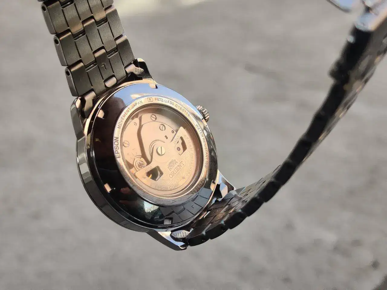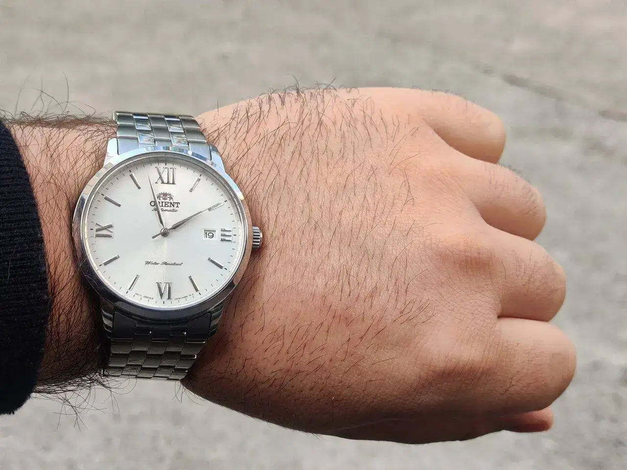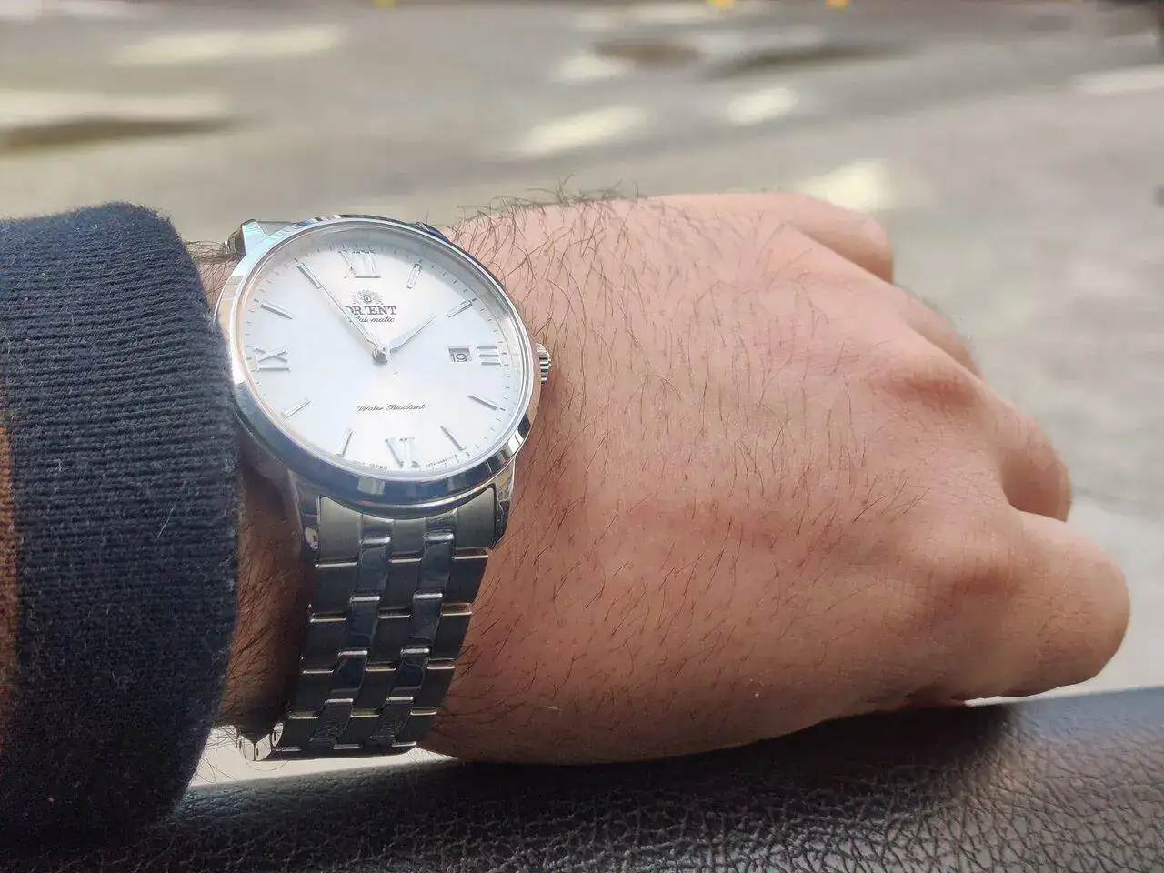 Se trata de un Orient Simphony IV. No es nada especial relojeramente hablando, es un reloj automático, simple, y económico. Para mi gusto muy bonito, que ofrece gran calidad por el precio que tiene, y en cuanto a su exactitud nunca lo calculé concretamente cuanto es, pero cuando lo llevo varios días seguidos, más o menos noto que pierde menos de 10 segundos por día. Lo de los números romanos no le agradan a la mayoría según leí por aquí pero a mí me gustan, y otro plus que le veo, es que se ve algo menos que el extendido y famoso Bambino. En su día cuando compré este no me molaba el cristal abombado del Bambino, y además quería uno con armis. Ahora el cristal ya me gusta más, así que algún día... El Bambino llegará quizás.