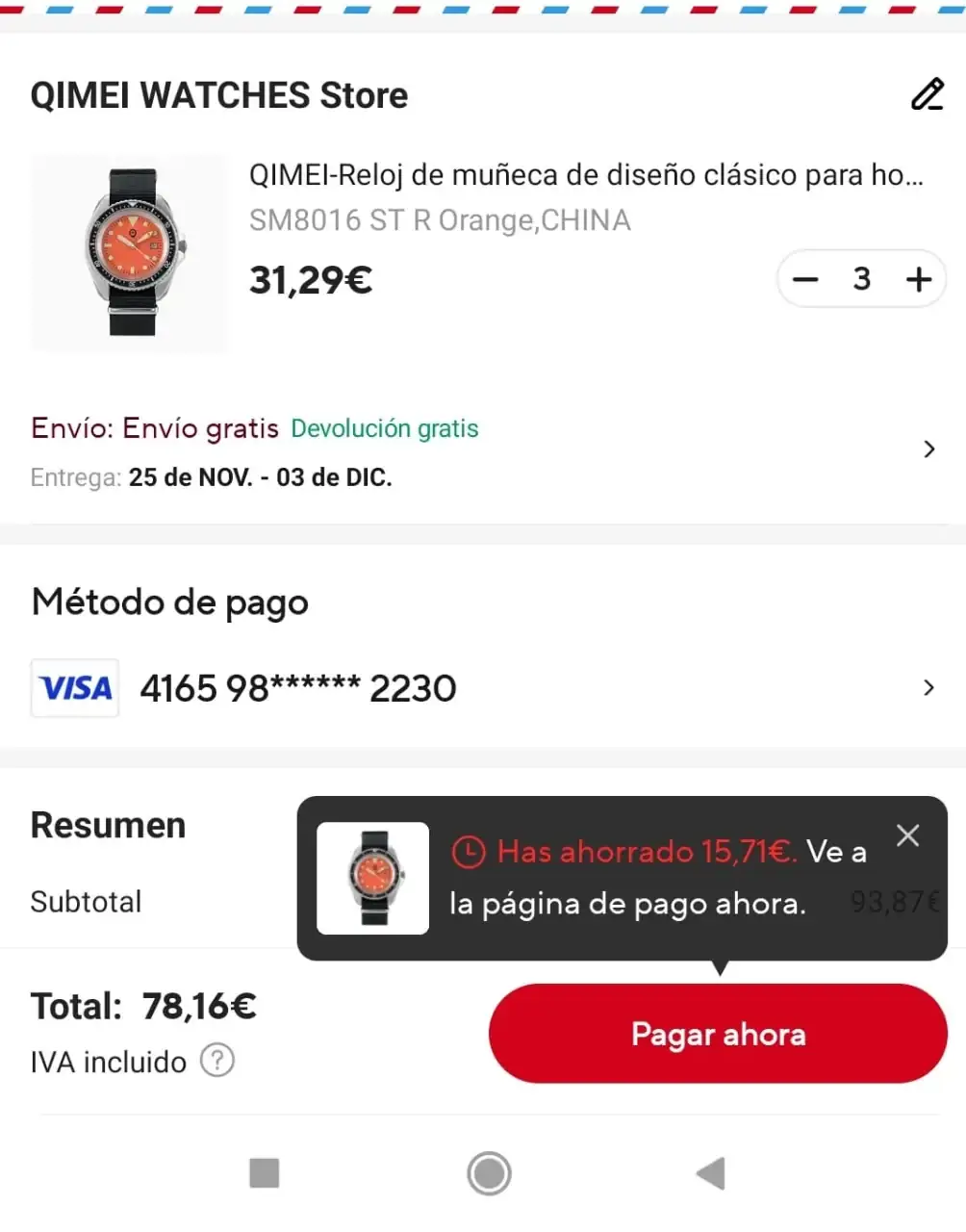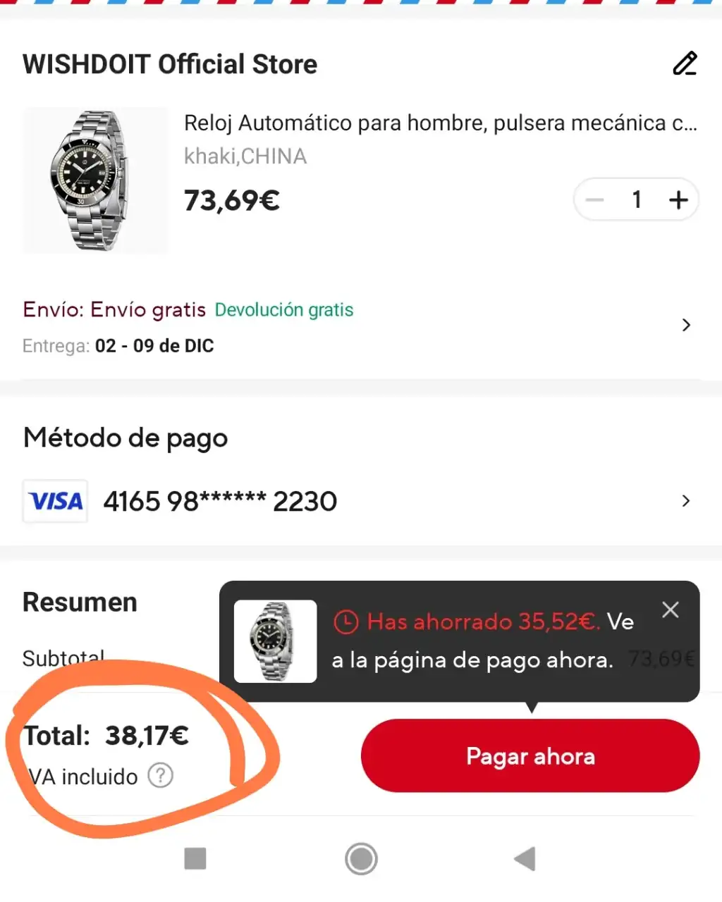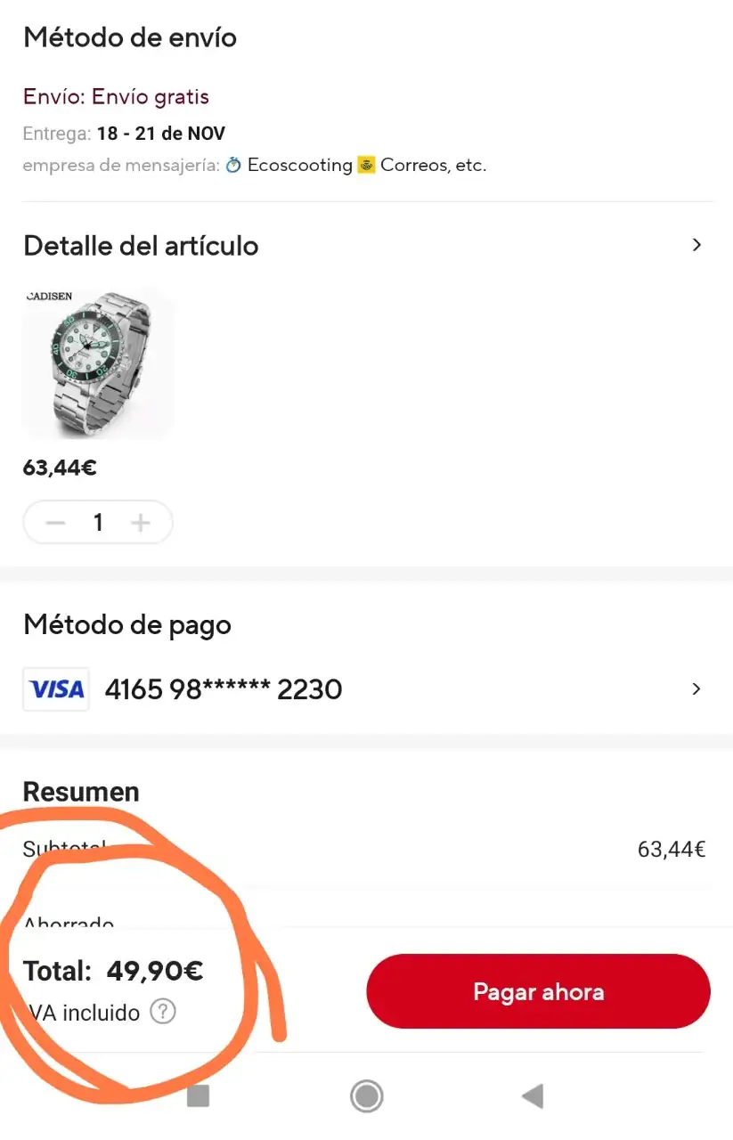 Hasta que no le demos a comfirmar el pedido no nos sale el descuento, luego abortamos la operación o seguimos para adelante. Segun el precio nos cuadre.