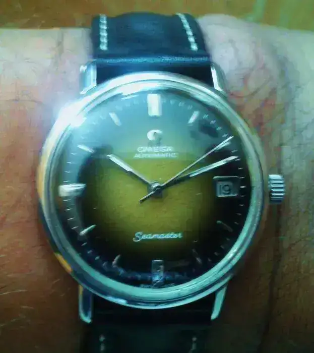 en un color como habana desvaido en la parte exterior de la esfera,que se vá aclarando según se acerca al cañón de las agujas,donde tiene un bonito color arena,marcadores metalicos a juego con las agujas.Caja en muy buen estado,plexy impecable..marcha muy buena para un reloj con unos cincuenta años a sus espaldas!
