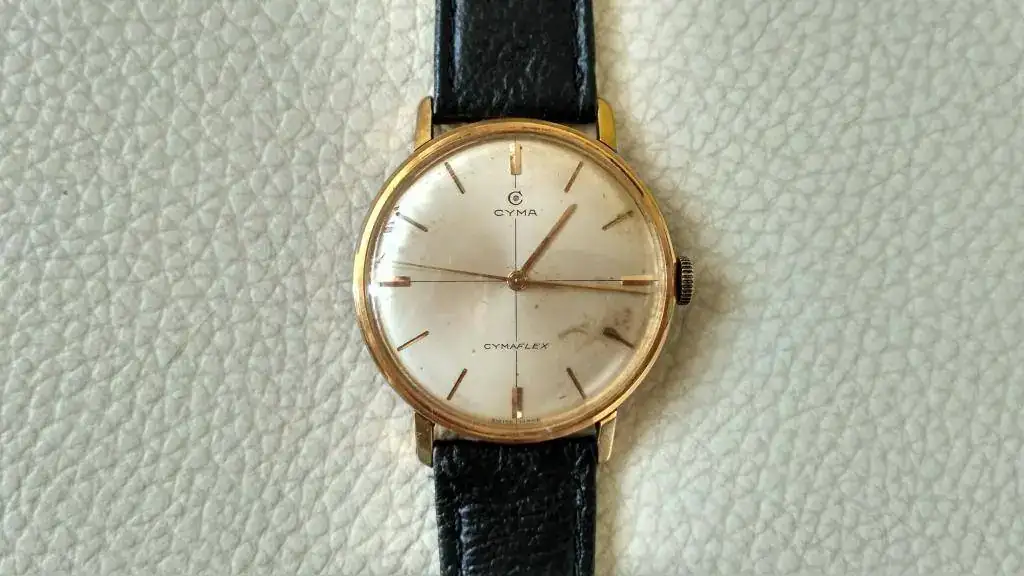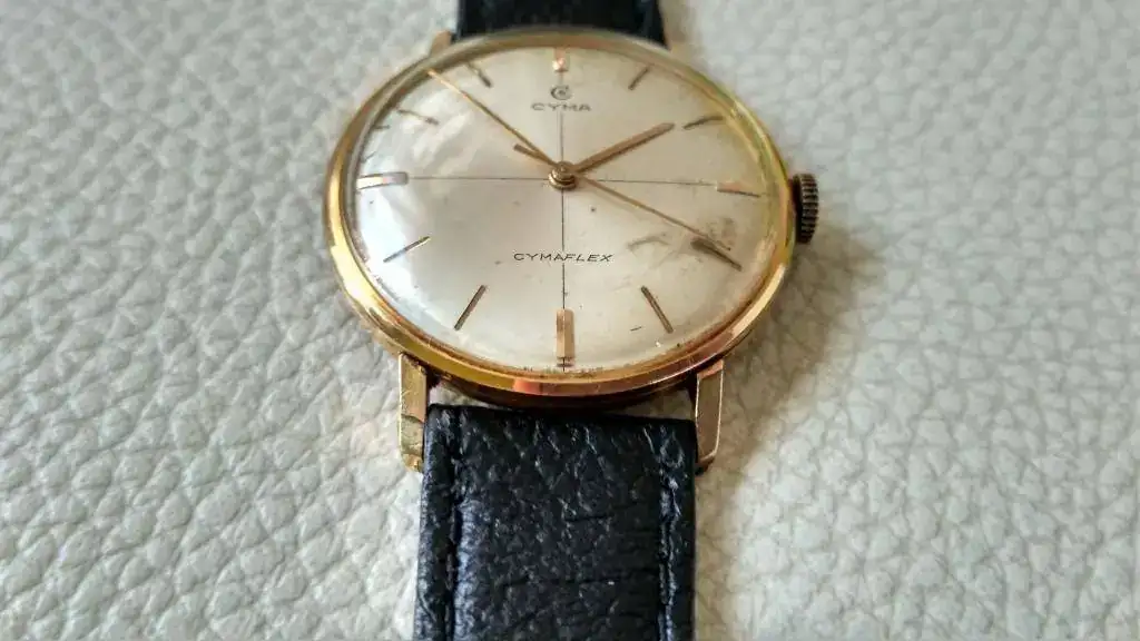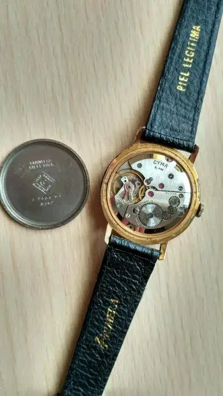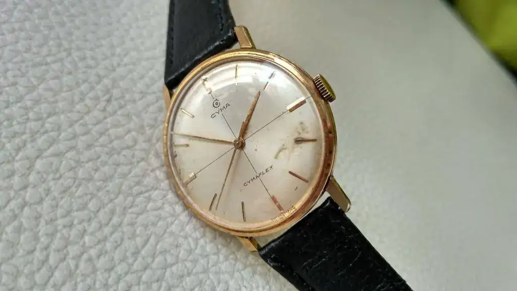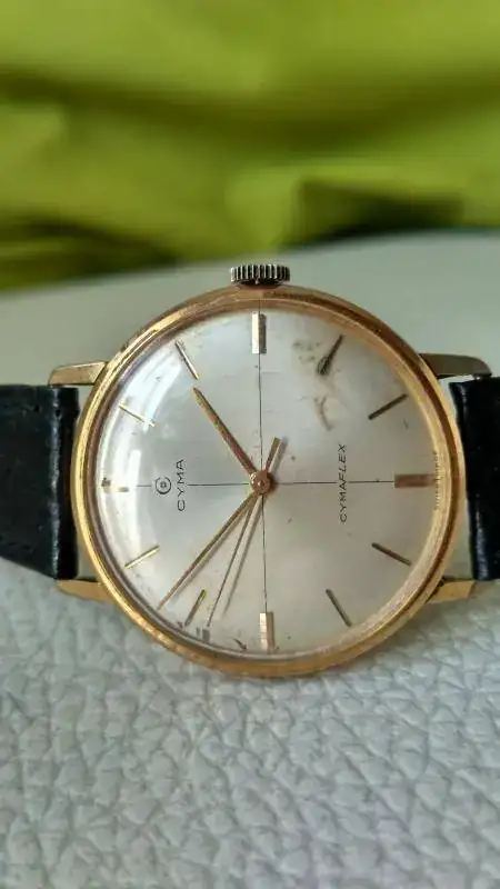 Pongo a la venta este clásico Cyma de mediados de los 60 en estado original (salvo quizá la corona, que no está marcada), dotado del calibre de manufactura Cyma 486 con segundero central y el famoso sistema anti choque patentado por la casa Cymaflex.