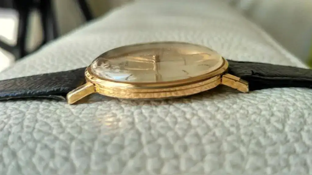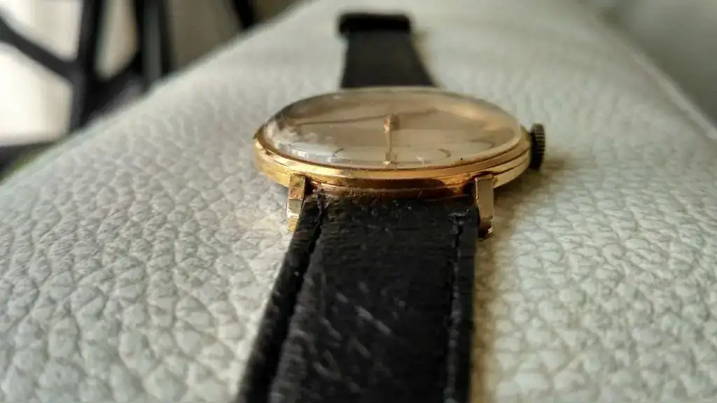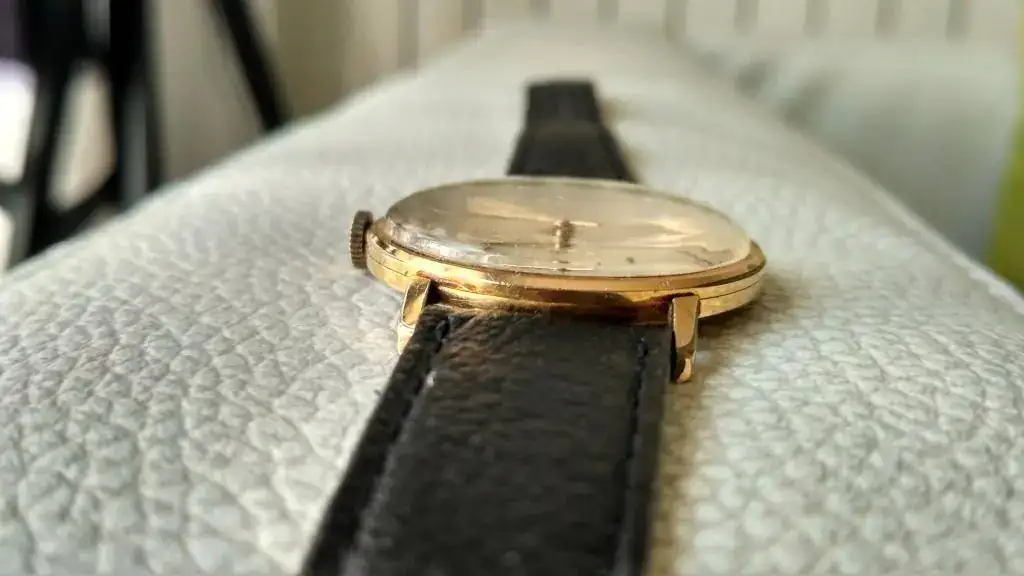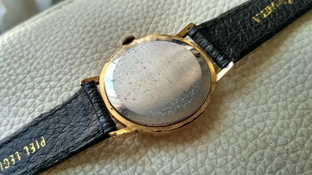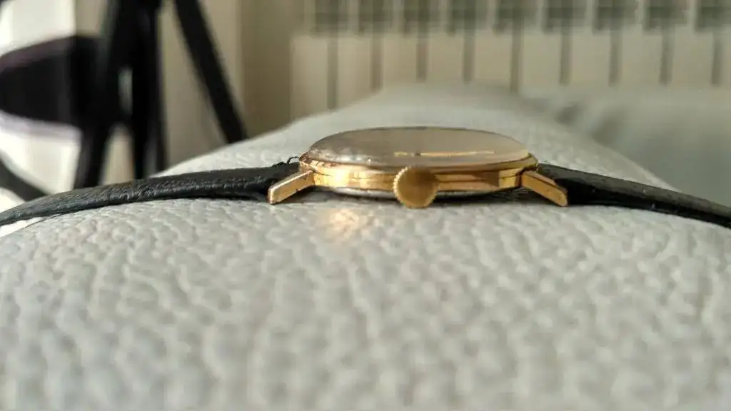 El reloj está en un estado decente, aunque presenta sus heridas de guerra (de ahí su precio ajustado), especialmente en el dial entre las tres y las cinco y entre las nueve y las diez. La caja es de 35 mm de diámetro, que aparentan ser más debido al fino bisel, el acabado es plaqué G20 y está en buen estado salvo por dos desconchones en cada una de las asas inferiores. Desconozco el historial de revisiones, pero la última vez que lo comprobé mantenía una buena marcha.