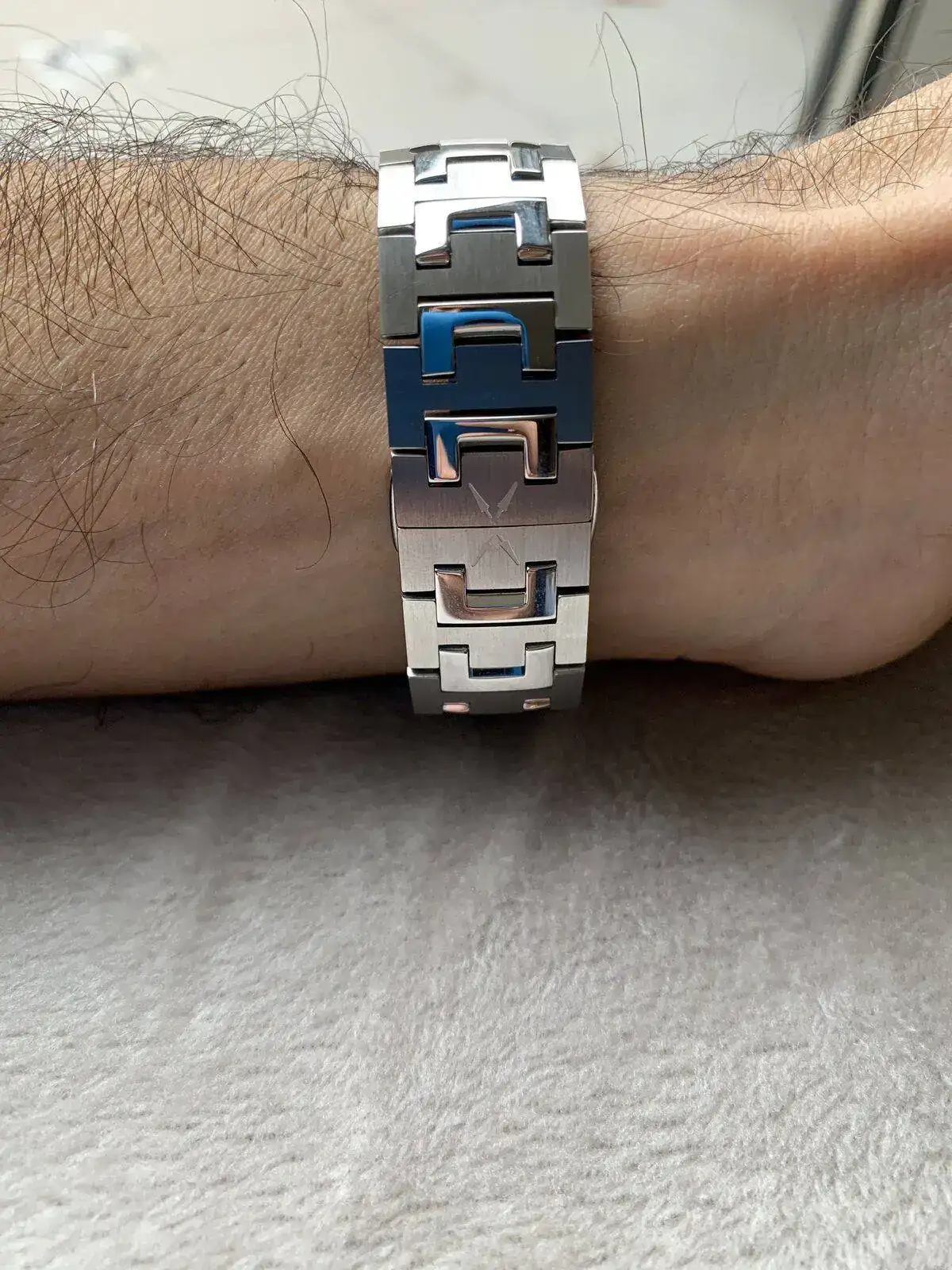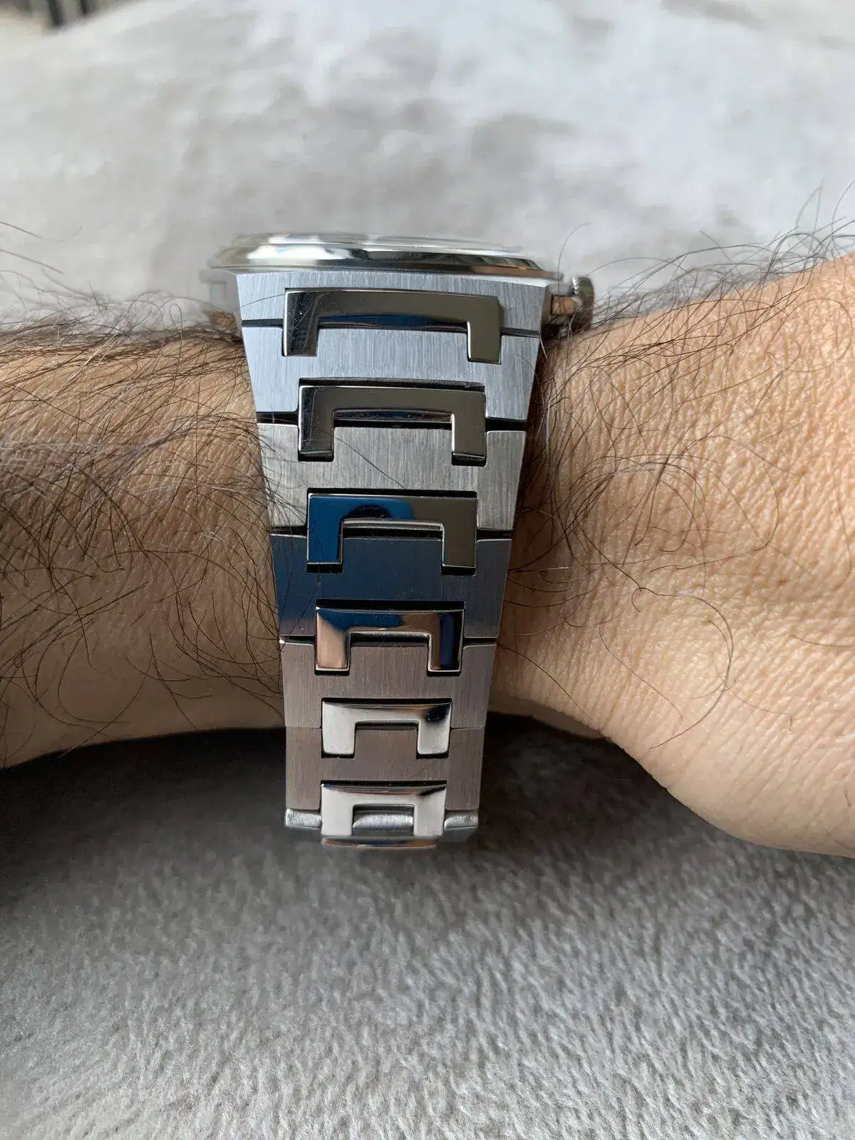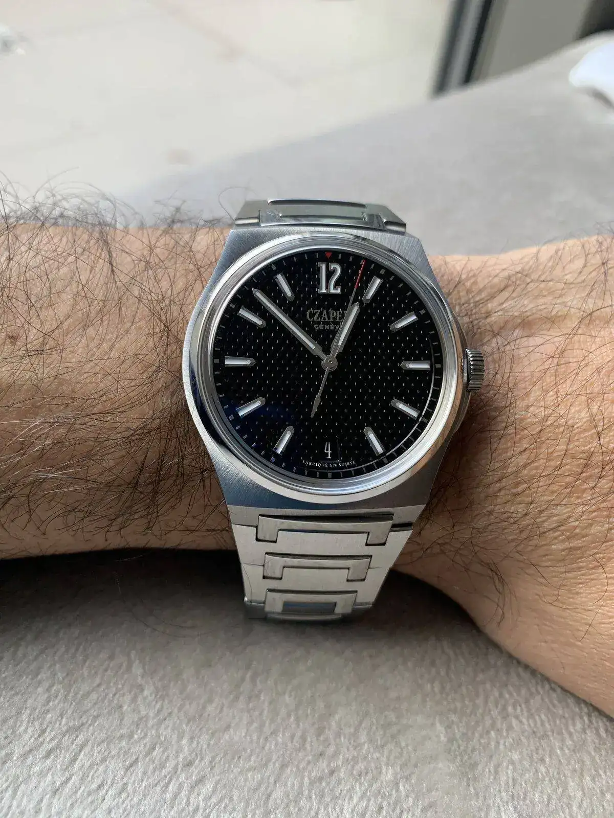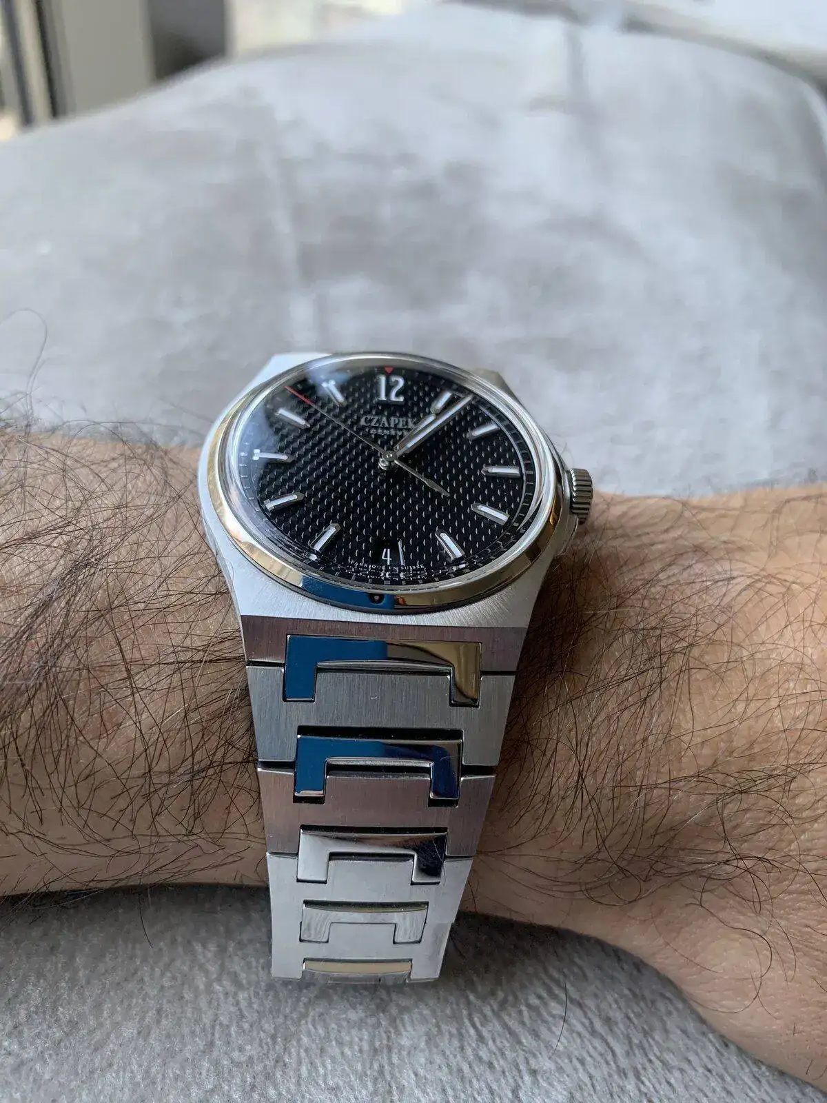 El diseño está claramente dirigido al sector de reloj deportivo de lujo con brazalete integrado y unos tratamientos de altísima calidad, destacando los brillantes eslabones centrales pulidos en forma de C de Czapek sobre las cepilladas hileras exteriores. Realmente en muñeca es muy atractivo. Precisamente junto con el del Overseas me parece el brazalete más cómodo y logrado de todos, y al pesar menos que el Overseas es incluso más cómodo (esto, sí que si no lo hubiera probado de verdad no me lo creería nunca).