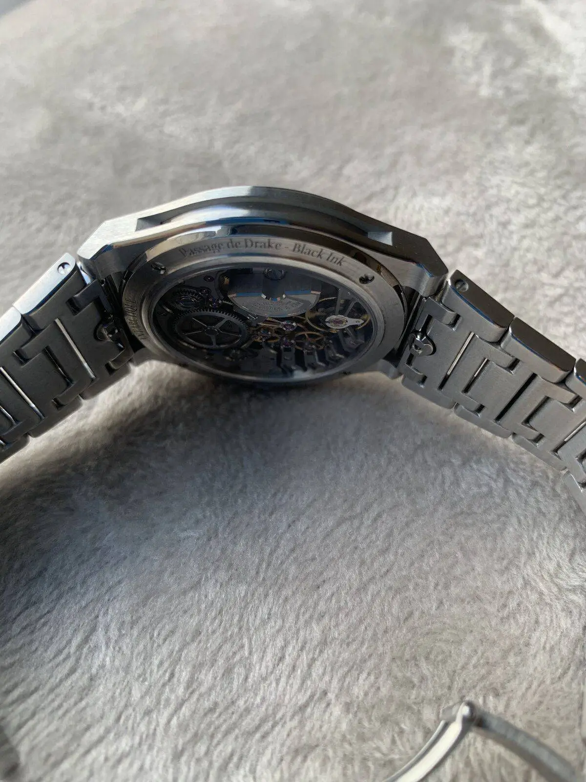 Hasta aquí todo correcto, en un muy alto nivel de puntuación en cada apartado pero nada que no hayamos podido ver en alguna otra marca de AR que tenga en un catálogo un modelo deportivo con brazalete integrado. Entonces, por qué este reloj es diferente y merece la pena el valorarlo como algo realmente competitivo en este sector tan poblado de grandísimas colecciones (Nautilus, Royal Oak, Overseas, Laureato, Ingenieur, Polo, Streamliner, Santos, Octo….). La respuesta está en la trasera. A mí este reloj me enganchó en el momento que vi una foto de su trasera. Sinceramente la primera vez que se observa impresiona y mucho. Es algo poco llamativo en brillos pero a su vez absolutamente precioso y que yo no había visto antes ese tipo de estructura en ese grado de seriedad de colores y acabados. La maquinaria es el calibre propio SXH5, de movimiento automático basado en un maravilloso micro rotor de platino que proporciona una considerable reserva de marcha, con siete puentes esqueletizados con sus ángulos interiores biselados a mano y decorados en color gris oscuro que destacan sobre manera respecto a las demás piezas del calibre. Haciendo que el observar cómo late el volante a 4Hz se convierta un auténtico placer para la vista. Esta estructura parece ser es más típica de los movimientos que llevan los tradicionales relojes de bolsillo que de los actuales calibres que solemos llevar en la muñeca. Y si lo que pretendían era hacer algo que se observara singular respecto a lo que había en el mercado, desde luego que lo han conseguido. Para mí sólo con lo que se ve en la trasera ya merece la pena tener este reloj en las manos. Sientes como si llevaras algo diferente, exclusivo y especial, y que estás deseando mostrar a cualquier amigo aficionado a los relojes que te encuentres ese día en el camino.