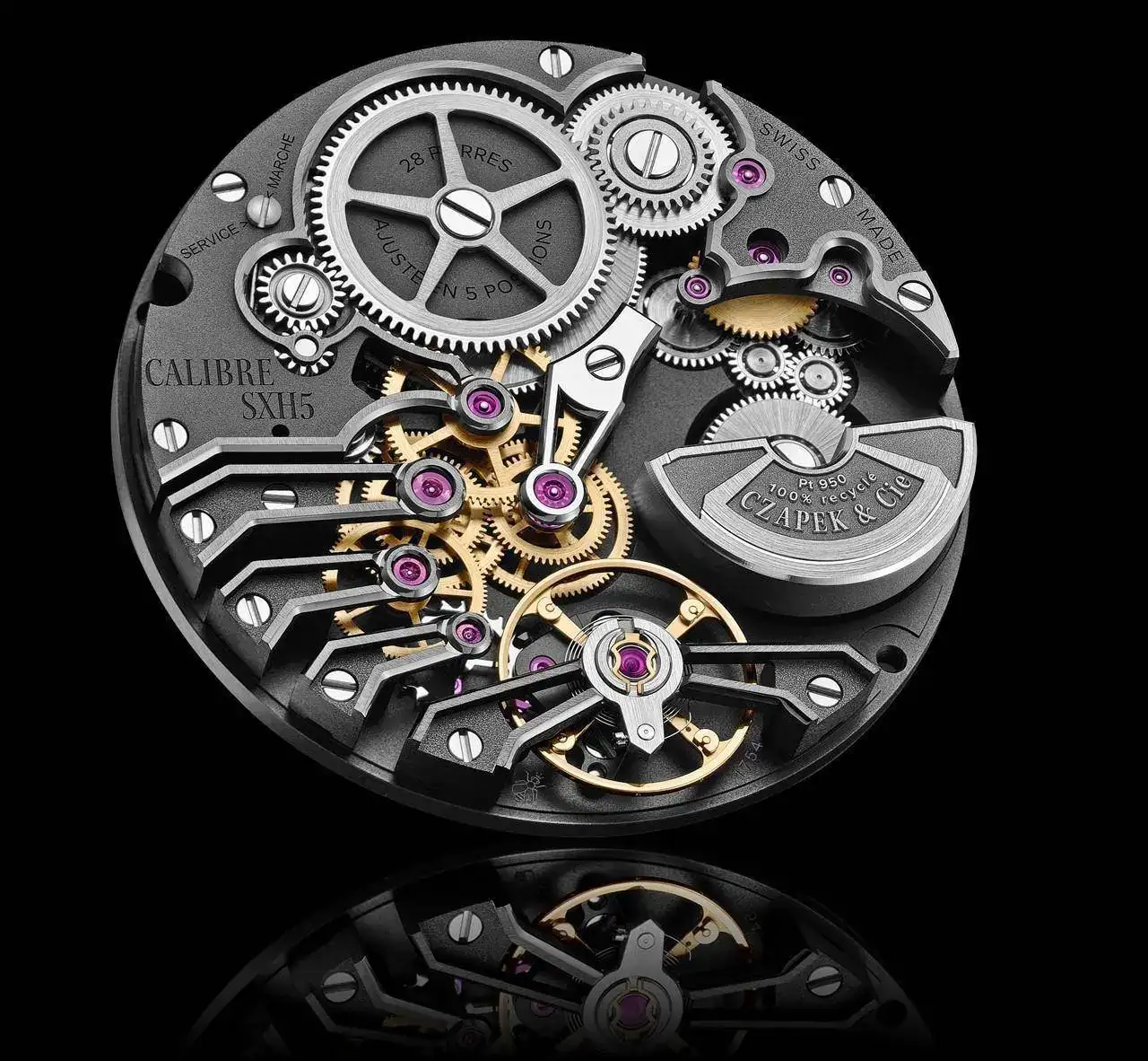 El corazón del Antartique Dark Sector es el robusto calibre automático SXH5 de Czapek, el primero en haber sido diseñado íntegramente in-house. La fuente de energía es un microrrotor de platino reciclado que ofrece hasta 60 horas de autonomía. El fondo visto permite ver una arquitectura de siete puentes, que recuerdan a los movimientos de los relojes de bolsillo del siglo XIX. Con un grosor de 4,5 mm se aloja perfectamente en la caja Antartique.