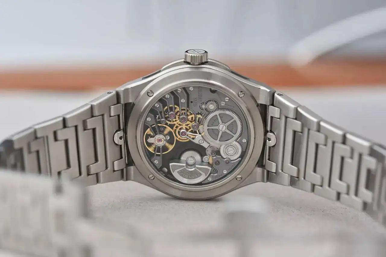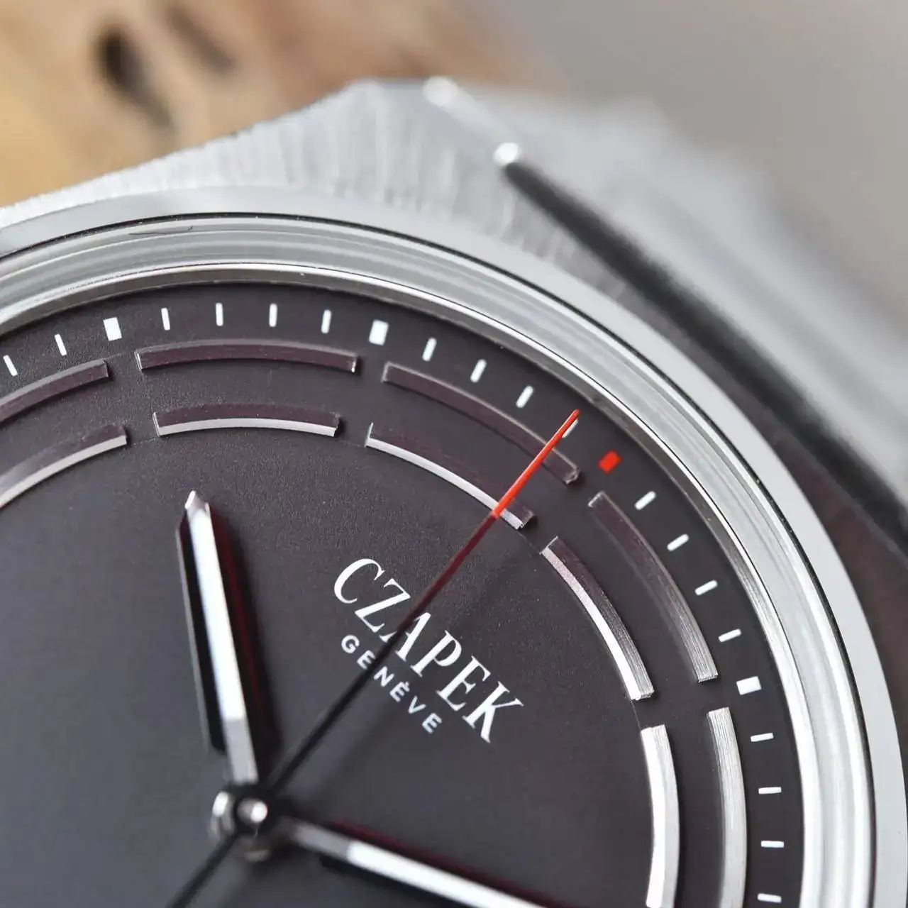 Alrededor del borde de una esfera antracita lisa se ha dispuesto un discreto indicador de minutos tradicional, que rodea una doble fila de segmentos paralelos ligeramente arqueados y que se interrumpen en cada número. La aguja de las horas en forma de espada apunta hacia los huecos como un buque disponiéndose a entrar en un puerto... se podría decir que el índice es el vacío entre cada sector, una manera casi filosófica de definir la materia.