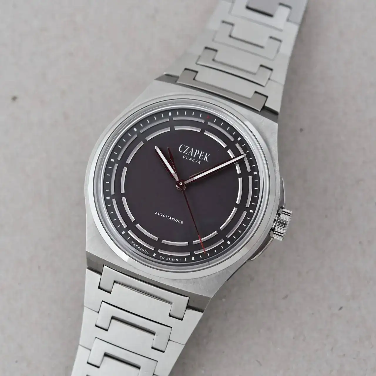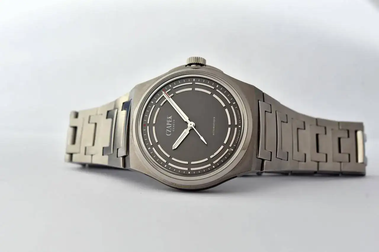 Teniendo una colección de éxito llamada Antartique, era sólo cuestión de tiempo que Czapek & Cie adjudicara ese nombre a alguno de sus modelos. Y no cualquier modelo: el Antarctique Titanium ‘Dark Sector’ surgió de forma natural de la caja y pulsera de titanio cepillado de la colección, con su protector de corona redondo. Estos tonos de gris inspiraron el patrón general monocromo del modelo, donde destacan los dos toques de color de la esfera, a saber, el punto rojo a las 12 y el extremo de la segundera.