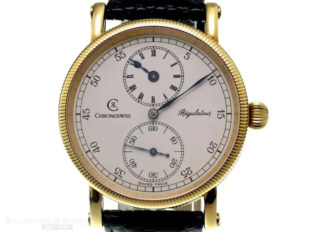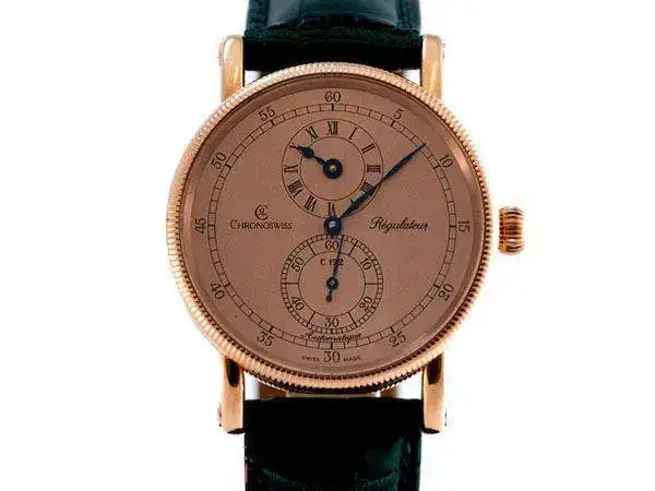 El Regulateur es un reloj precioso, la simetria en la esfera, la posicion de las subesferas, la agujas, la caja con fondo de rosca y siempre visible, los modelos mixtos con el fondo en oro como el bisel, la corona en forma de cebolla de los relojes de bolsillo, las asas con el sistema de rosca para la correa, el primer reloj que yo sepa de bronce (20 anos antes del Bronzo de Panerai), el calibre Marvin en los cuerda manual y su movimiento automatico (de Enicar solo tenia los puentes y algo mas).En el ‘95, viviendo en Suiza como “ejecutivo agresivo”, compré un Régulateur de Chronoswiss que me impresionó sólo verlo en el escaparate (foto de la red):