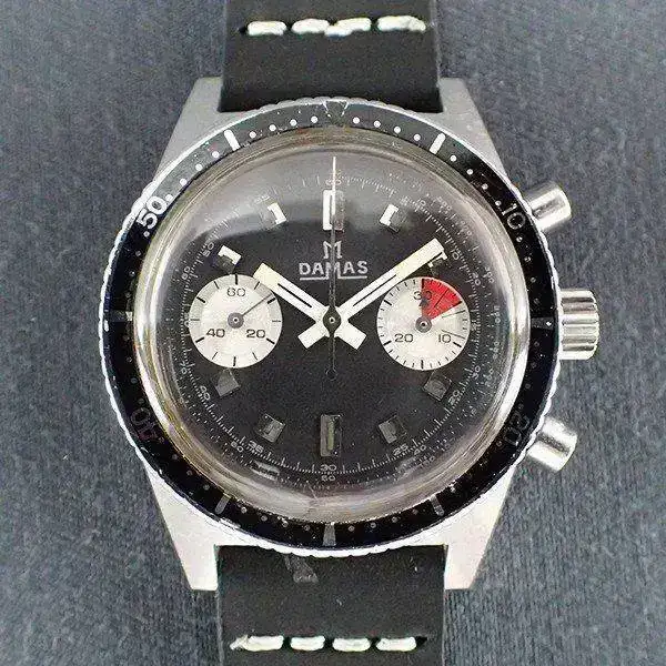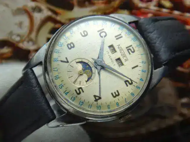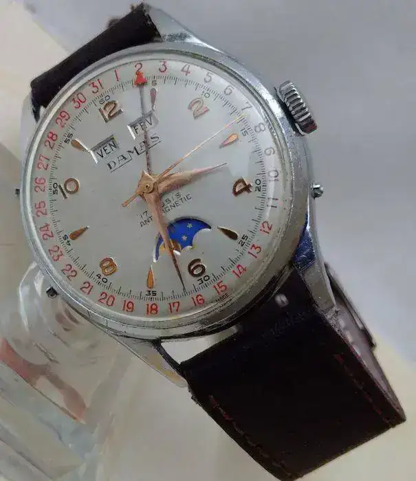 En cuanto a Damas, tampoco he encontrado mucha documentación fiable, más allá de que aparece en registros y ligada a Beguelin a partir de 1950, con gran presencia tanto en la publicidad como en los movimientos. Sin embargo, he leído una cosa que no sé hasta qué punto es verdad pero es bonita, así que os la cuento. Parece ser que en Tabriz, Irán, había un establecimiento regentado por un tal Samad Rezvan y su hermano, que distribuían diversas marcas famosas de relojes y que, al igual que hacían en muchos países otros relojeros (Cuervo y Sobrinos, Tiffany…), los estampaban sus propias marcas. En este caso, dos marcas: Damas y Navzer, que no son sino su propio nombre al revés (Samad – Damas, Rezvan – Navzer) y que se supone explica la existencia de muchos vintages con estas marcas en Oriente Medio. Os muestro dos ejemplares de calendógrafo con fase lunar y aquí lo dejo