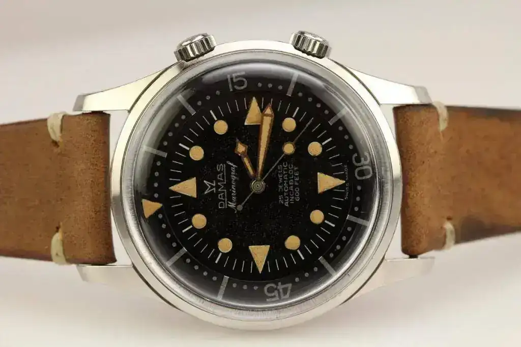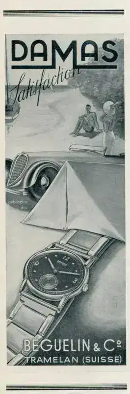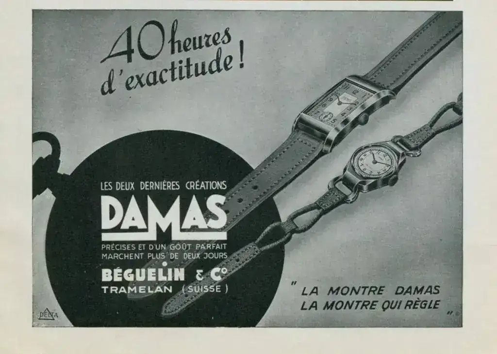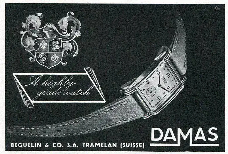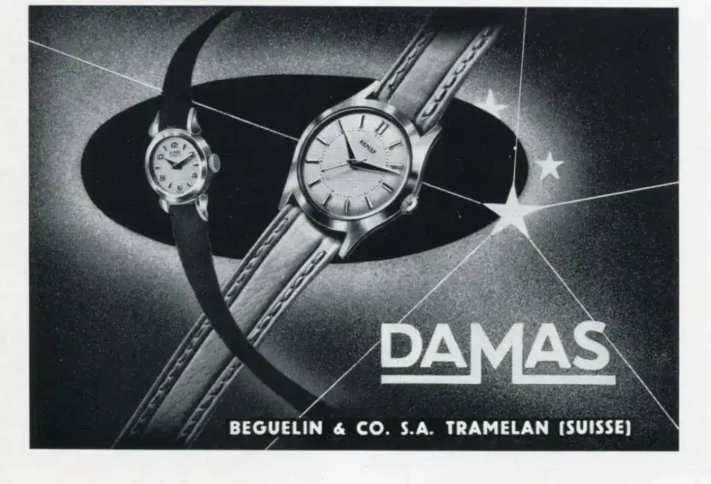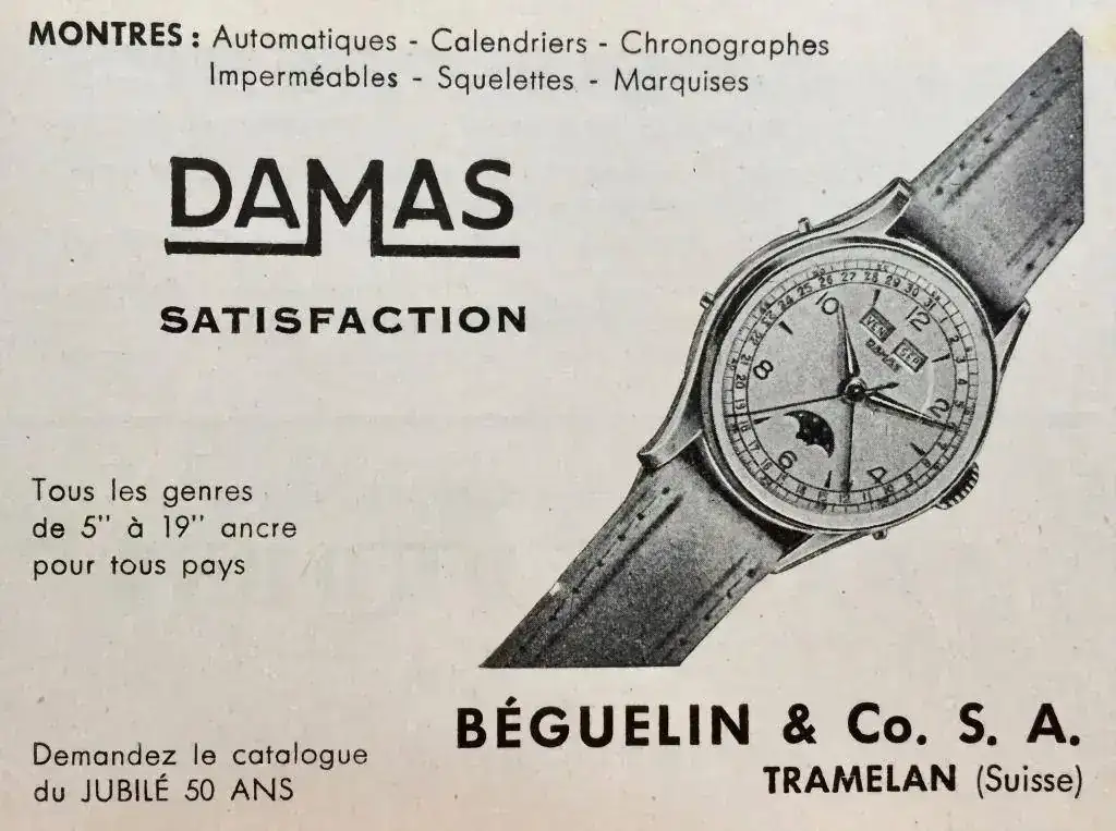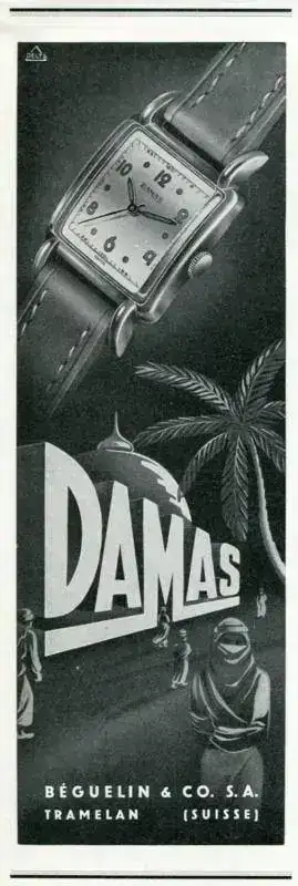 Comenzó como una fábrica de d'ébauches, la primera de Tramelan y a partir de 1907 logró producir relojes completos y convertirse en manufactura de apreciada calidad. En 1941 su especialidad eran los relojes de bolsillo, y también los relojes de pulsera estancos, como se recalca en sus publicidades. La empresa producía además sus propios antichoques, el Damashock y el Damaflex, que aparecían citados en algunas esferas de la marca. Se mantuvo como manufactura hasta 1951, fecha en que se concentra de nuevo en la fabricación de d’ébauches. En 1972 se fusiona con A. Reymond SA (ARSA) y Hoga Watch SA, quedando bajo la razón social de ARSA. En cuanto a Damas, tampoco he encontrado mucha documentación fiable, más allá de que aparece en registros y ligada a Beguelin a partir de 1950, con gran presencia tanto en la publicidad como en los movimientos. Sin embargo, he leído una cosa que no sé hasta qué punto es verdad pero es bonita, así que os la cuento. Parece ser que en Tabriz, Irán, había un establecimiento regentado por un tal Samad Rezvan y su hermano, que distribuían diversas marcas famosas de relojes y que, al igual que hacían en muchos países otros relojeros (Cuervo y Sobrinos, Tiffany…), los estampaban sus propias marcas. En este caso, dos marcas: Damas y Navzer, que no son sino su propio nombre al revés (Samad – Damas, Rezvan – Navzer) y que se supone explica la existencia de muchos vintages con estas marcas en Oriente Medio. Os muestro dos ejemplares de calendógrafo con fase lunar y aquí lo dejo
