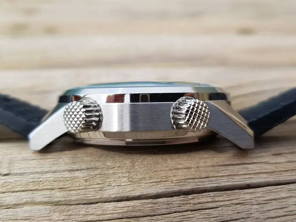 La caja está muy bien trabajada, con detalles en pulido y cepillado muy correctos. Las dos coronas tienen un efecto “cross-hatch” o reticulado que le da un aspecto muy bonito. La corona a las 4 es roscada y sirve para ajustar la hora y la fecha. La asas son cortas y hacia abajo lo que hace que se encaje en la muñeca perfectamente.