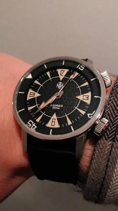 El dial es negro mate, netamente inspirado en los finales de los 60, lleva los índices aplicados de color marrón claro, simulando un precioso lume vintage, un anillo de color gris con lume aplicado y un bisel interno de acero que gira con la corona a las 2 (que no es roscada). Las agujas, tanto la horaria como la minutera, están compuestas por tres rayas, con una línea central negra intercalada entre dos líneas de color marrón.