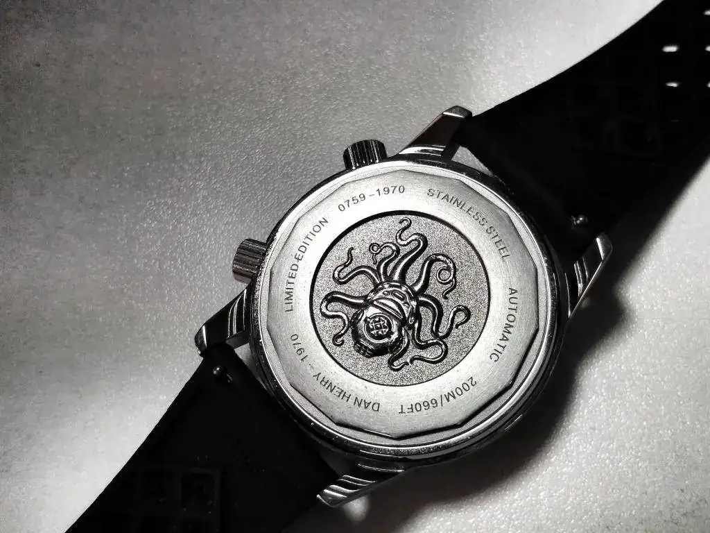 La tapa trasera es roscada, preciosa, al estilo vintage y lleva estampada la figura de un pulpo con un casco de buzo antiguo a lo que el fabricante denomina: “Scaphtopus”. La calidad es asombrosa y el nivel de detalle impresiona. Lleva además indicado la marca, el modelo, la resistencia al agua (200m) y el número ya que es una edición limitada a 1970 piezas.