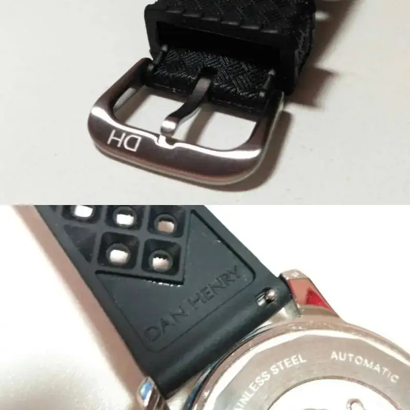 La correa tipo tropic es de una silicona suave y que no atrae el polvo. Tiene un ancho de 22mm en el asa y se estrecha hasta 18 mm a la altura de la hebilla lo cual la hace increíblemente cómoda. La correa lleva los pasadores incorporados (también esta es otra mejora de la versión anterior) para el “cambio rápido” y viene firmada por dentro y la hebilla lleva grabado el logo DH.