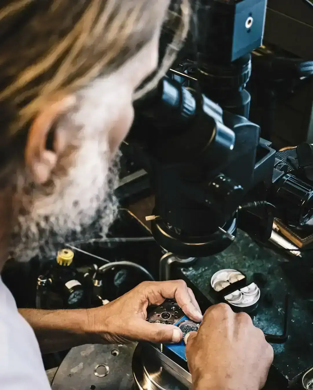 Por supuesto, ya me conocéis; le pedí a Marius si me dejaba tomar alguna foto de la tapa y el reloj en su taller, con los cachivaches que tiene por allí para hacer su trabajo. También le pedí que "posara" un poco e hiciera como si trabajara para así tener un recuerdo. Las fotos no dan crédito suficiente a la realidad, pero sí que dejan ver el trabajo minucioso y casi perfecto del artista.