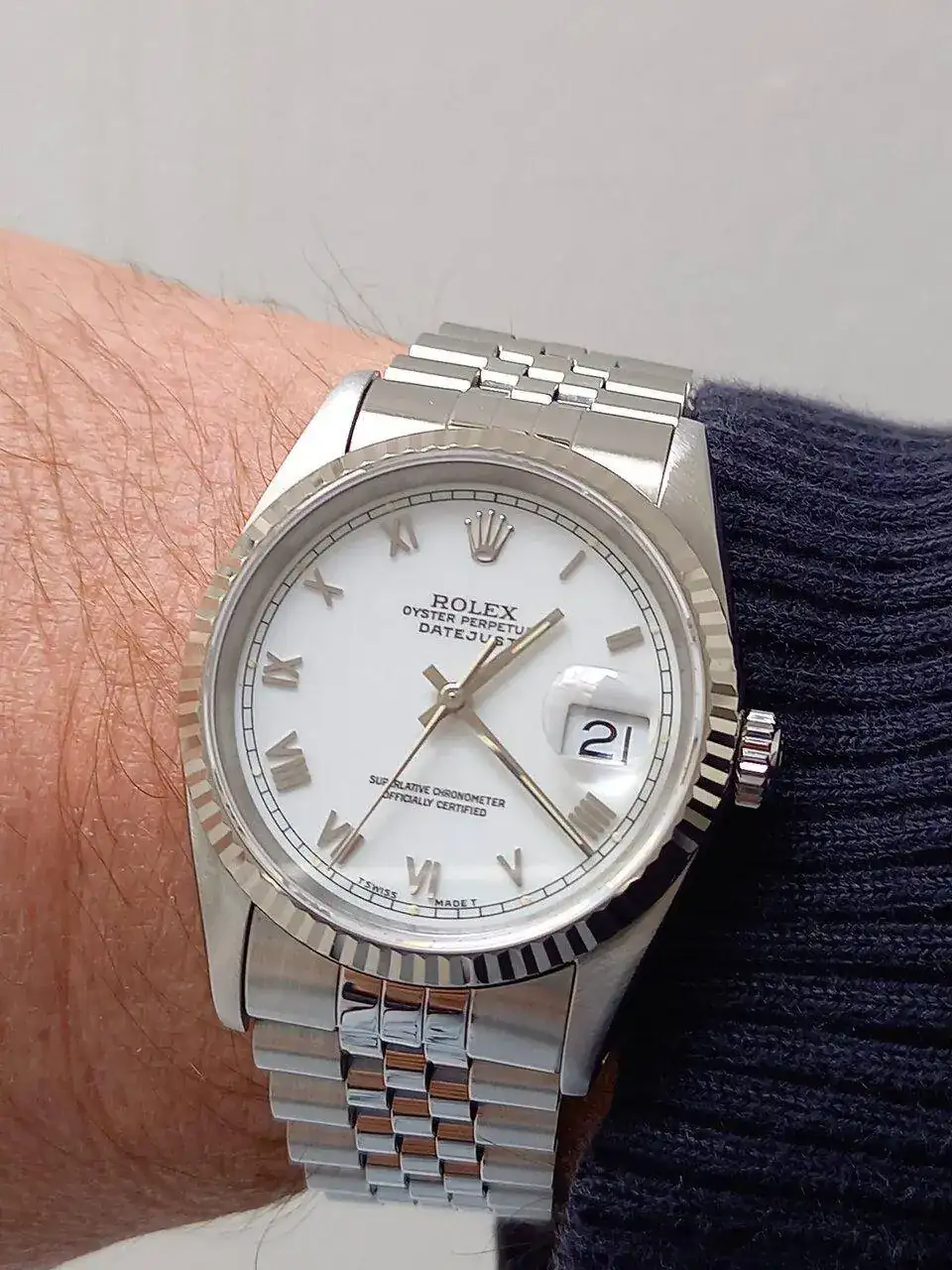 Mi combinación favorita es 36 mm con bisel estriado y jubilee. Para el OP elegí el 41 pero el DJ tiene mucha más superficie pulida y me da la impresión de que llena más la muñeca. Te dejo un par de fotos en mi muñeca de 17,5, una de mi OP y otra del DJ 41 que me probé: