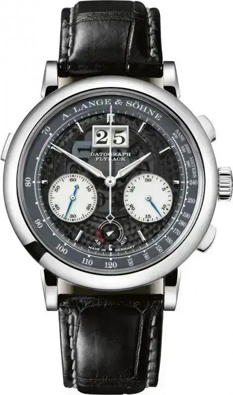 A. Lange & Söhne estableció en 1999 con el DATOGRAPH una nueva referencia en la construcción de cronógrafos. Su función flyback permite realizar de manera inmediata varios cronometrajes consecutivos. Al accionar una sola vez el pulsador situado a las cuatro horas se interrumpe un cronometraje y se inicia instantáneamente el siguiente. Esta función suplementaria poco frecuente ahorra tiempo porque los tres accionamientos necesarios hasta entonces para parar, poner a cero y reiniciar se han sustituido por un único accionamiento del pulsador gracias a la mecánica flyback.