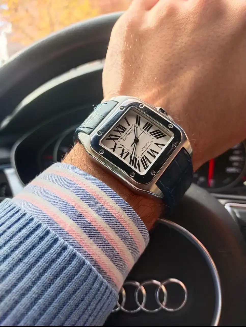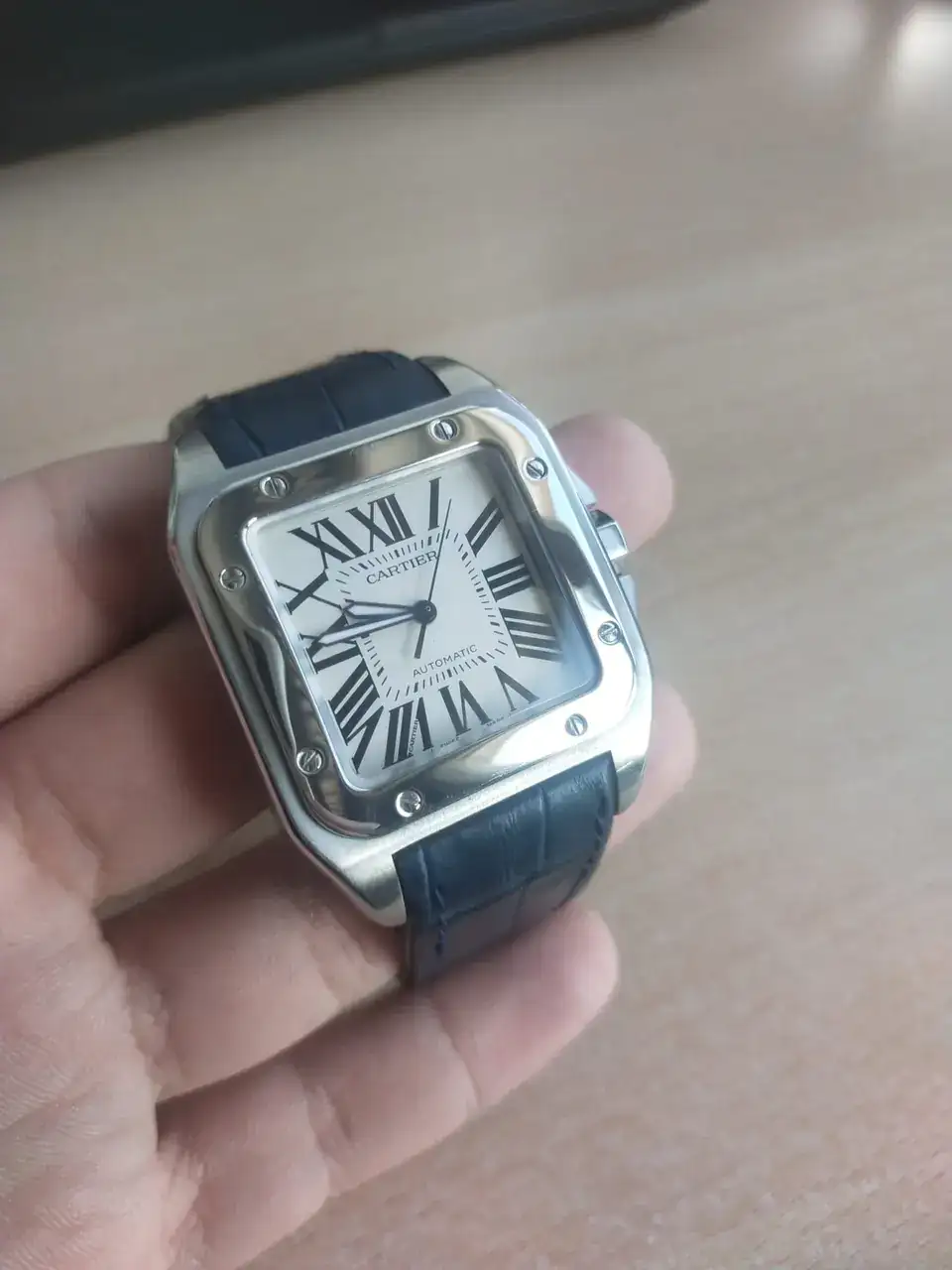 1. Cartier Santos 100XL. Mi primer reloj de alta gama. No es mi favorito, pero si solo pudiera tener un reloj "bueno" sería este. Para mí es uno de los iconos de la relojería junto al Speedmaster y el Submariner. Lo elegí por encima de otras piezas por su estética inconfundible y diseño atemporal (dista muy poco del primer santos de la historia). También me gusta mucho lo bien que le quedan correas de diferentes colores, pero tuve una mala experiencia cambiándolas asi que llevará más de un año con la azul, una pena el miedo que he cogido a mudarla.