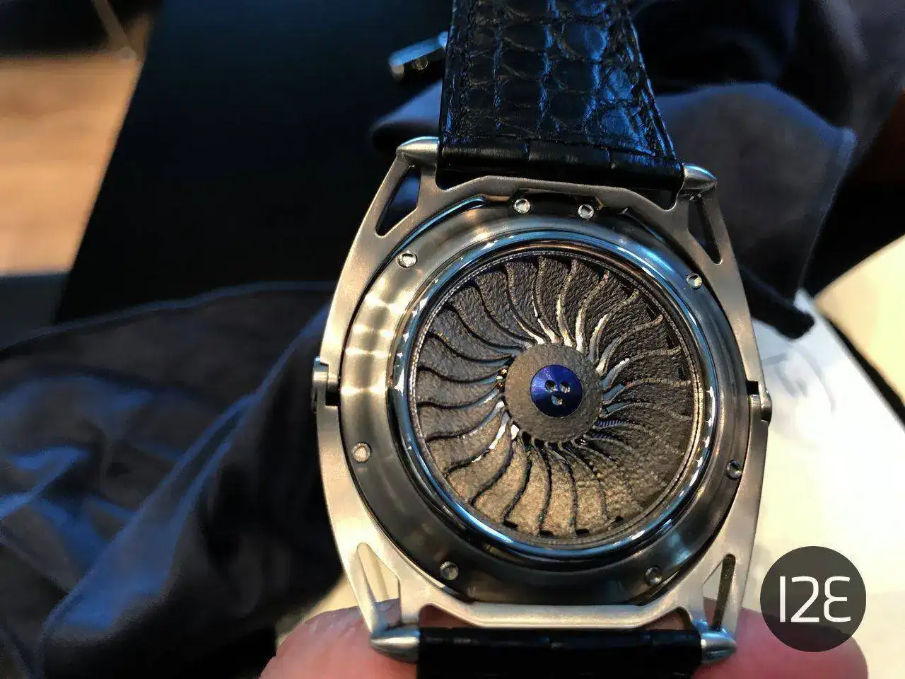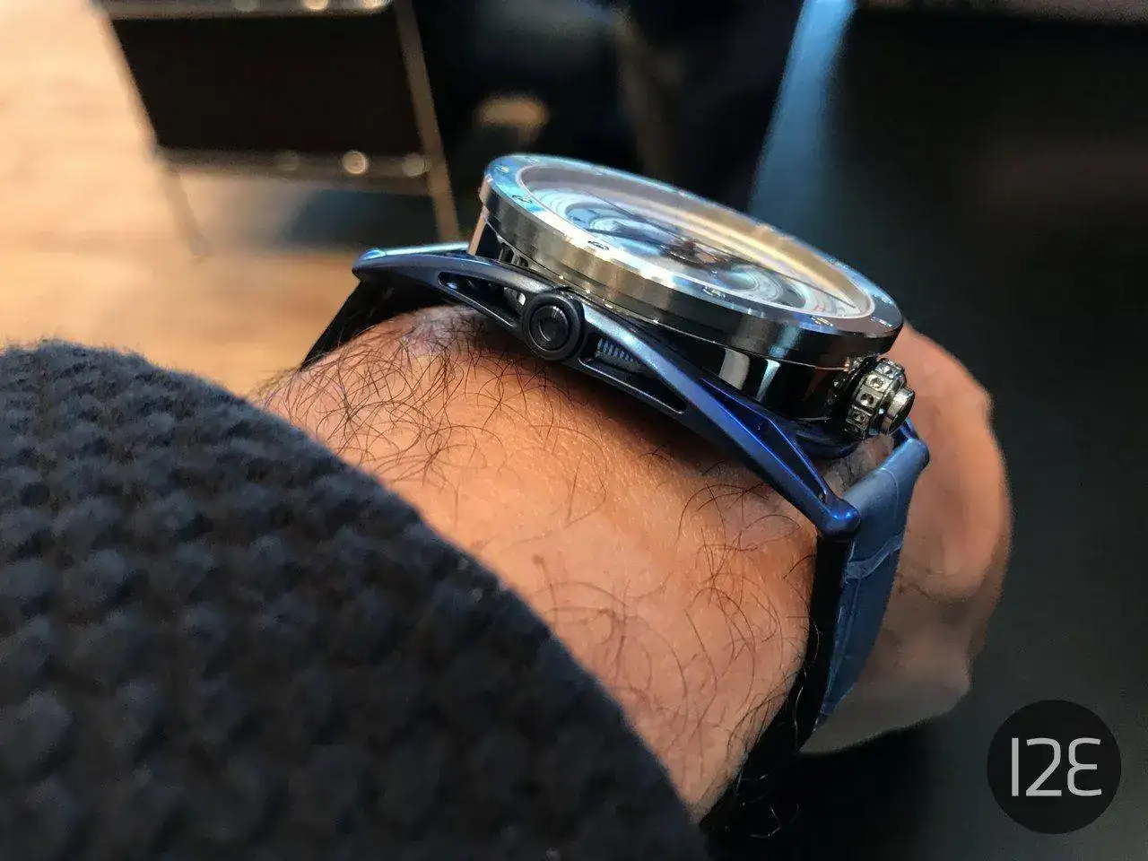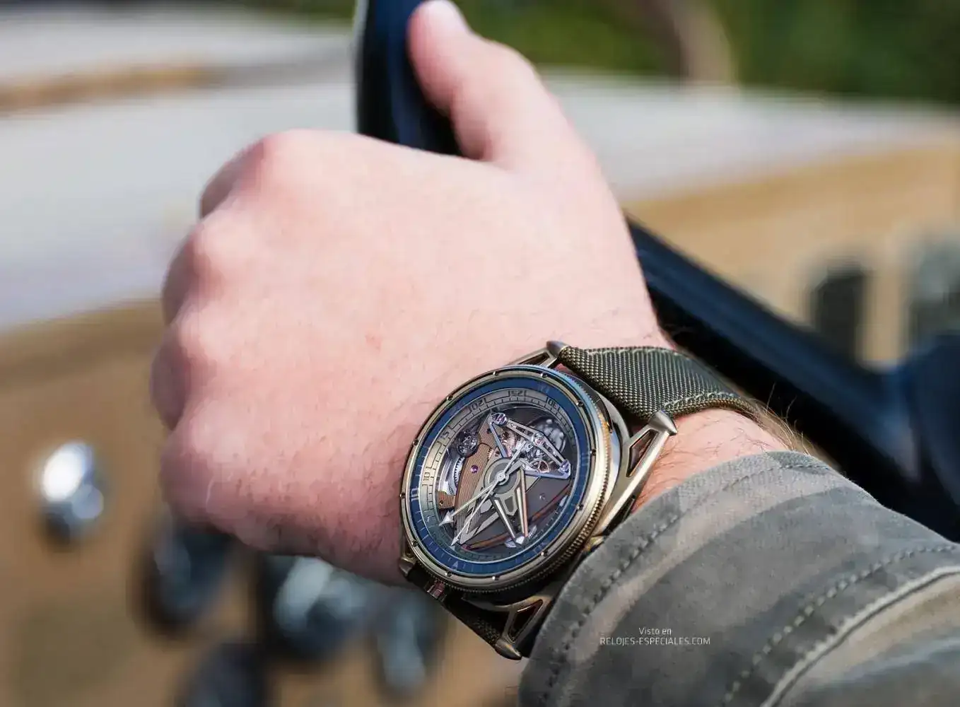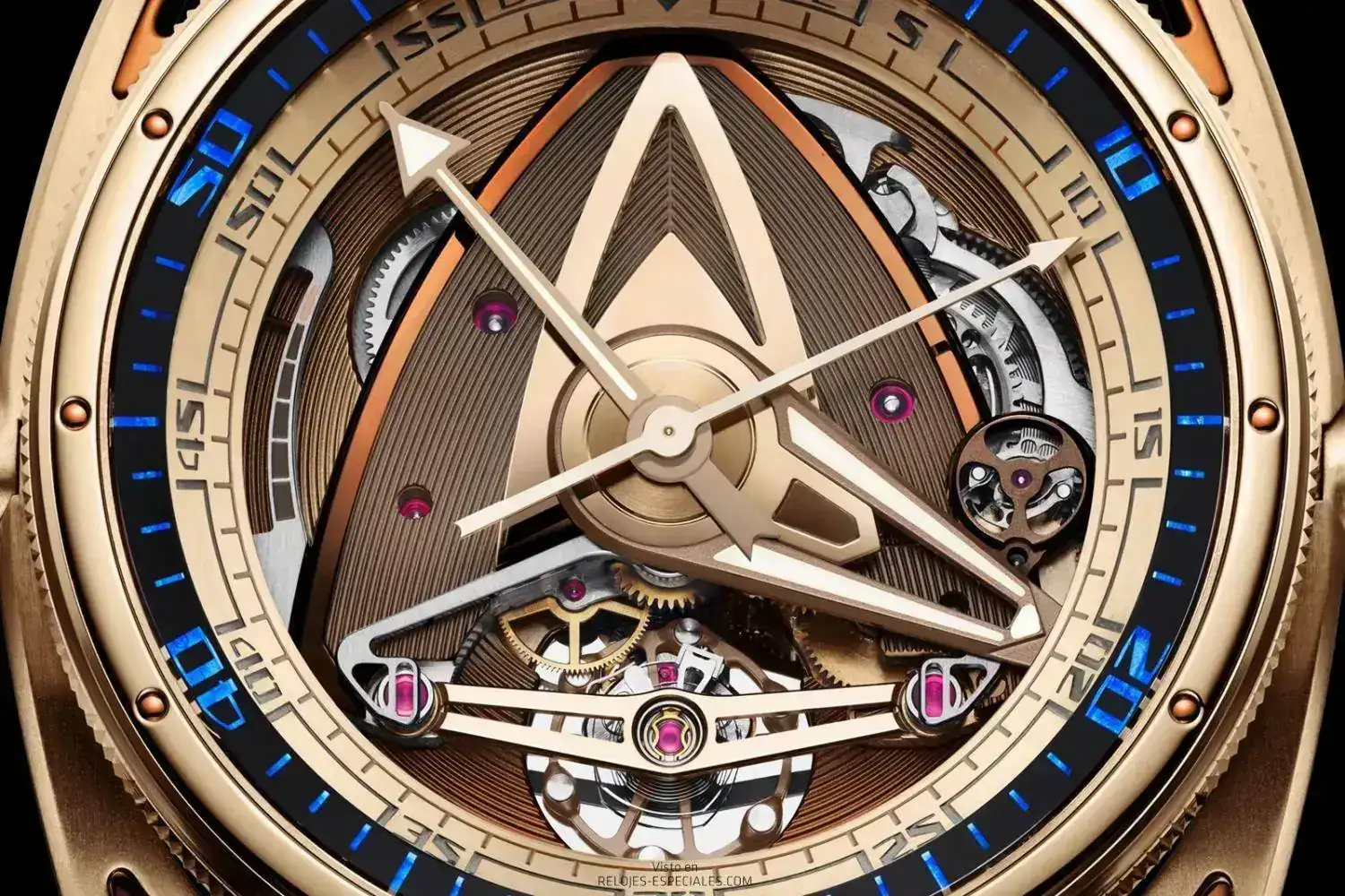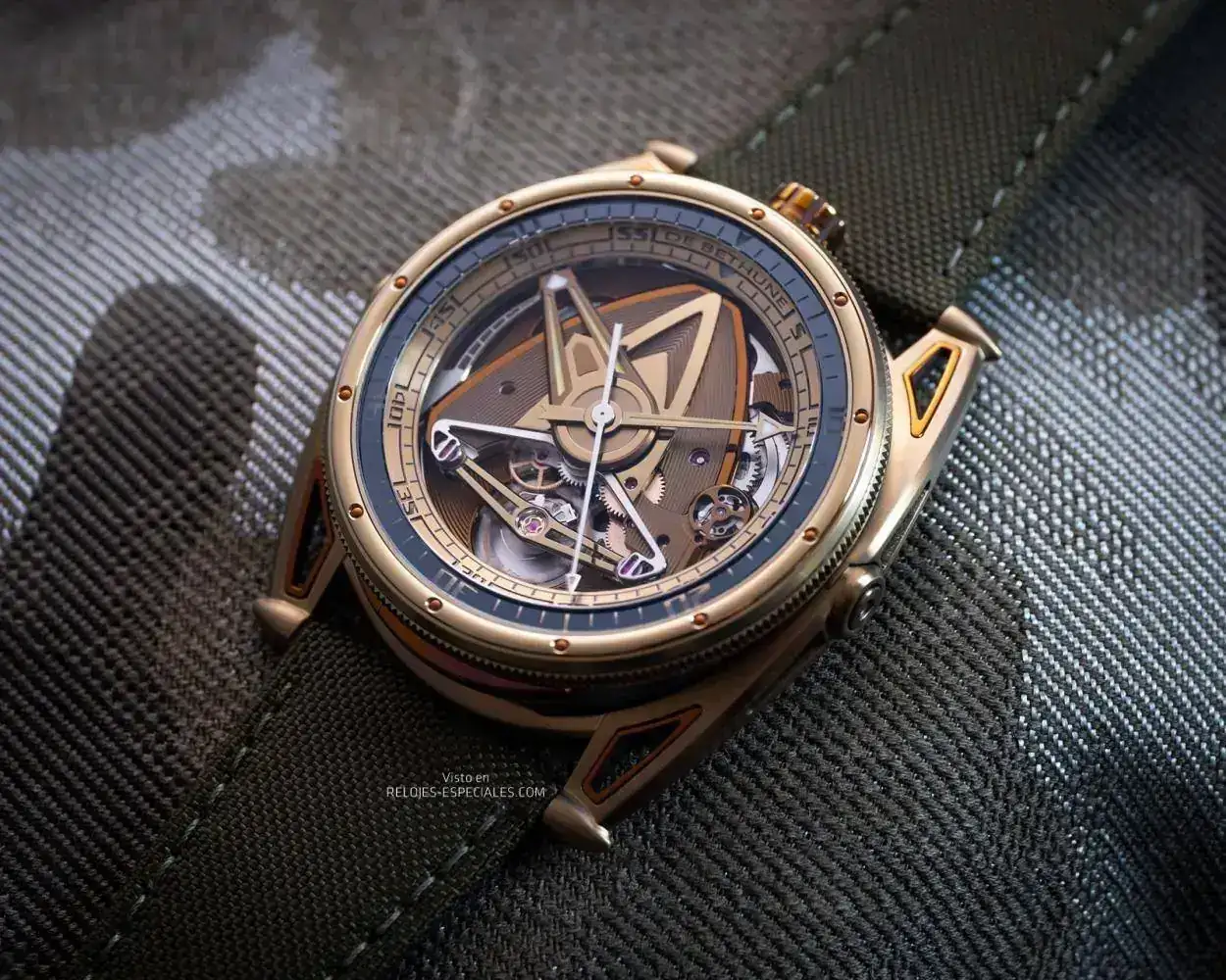Vamos por partes. El amarillo se consigue mediante una técnca de oxidación y calentamiento del titanio grado 5. Y no sólo en la caja: para conseguir un color uniforme, también algunos componentes del calibre pasan por esas fases, lo que obliga a un continuo control de forma y masa de los mismos. Aun así, se producen pequeñas variaciones que de hecho son esenciales para la percepción y el impacto visual que producen.