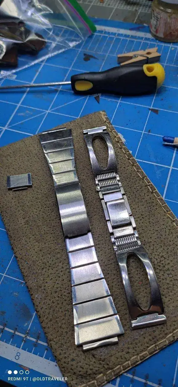 con un curioso sistema de acortamiento, que tiene un "pestillo" que libera el eslabon de union, muy ingenioso, el brazalete, ademas, me confirmo el relojero que nunca habia sido usado, tiene algunas marcas por haber estado malamente guardado en esa caja llena de roña y mugre, pero nada que una buena aceitada y pulida no puedan solucionar.