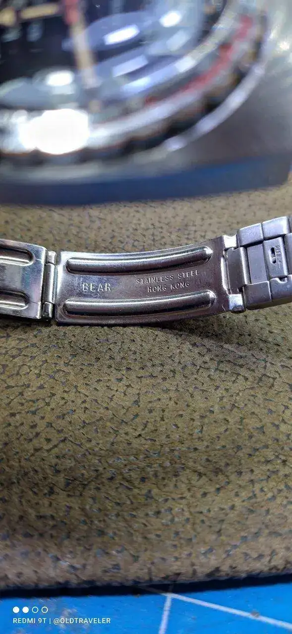 ), el dia de ayer merodeando por una vieja relojeria, me tome un rato para platicar con Don Sergio, estuvimos hablando un rato, y cuando tocamos el tema de los brazaletes, le pregunte si no tenia algun brazalete "viejito", yo en ese momento llevaba uno de acero perforado tipo "sure stay", y me comento que recientemente habia encontrado una caja con algunas cosas viejas, me enseño una caja de carton con un monton de correas de hule, cajas de relojes y en el fondo un par de piezas llamaron mi atencion.Un brazalete chino, de Hong Kong, de la marca Bear (en mi vida habia oido de esa marca), y un brazalete generico muy "setentero".