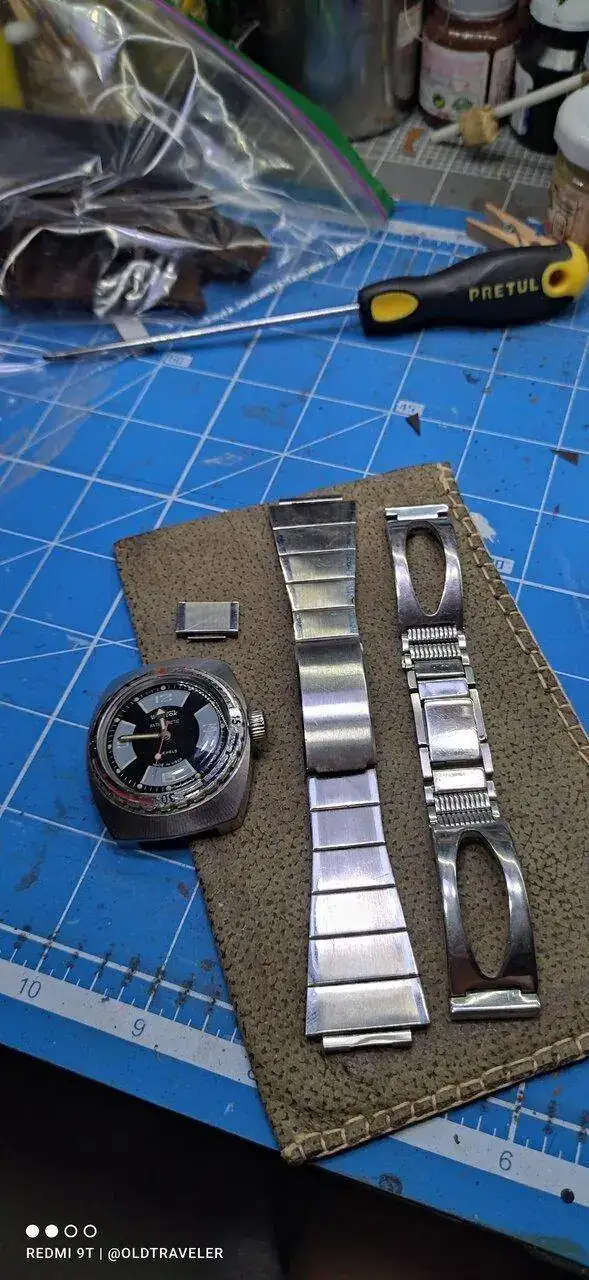 ), el dia de ayer merodeando por una vieja relojeria, me tome un rato para platicar con Don Sergio, estuvimos hablando un rato, y cuando tocamos el tema de los brazaletes, le pregunte si no tenia algun brazalete "viejito", yo en ese momento llevaba uno de acero perforado tipo "sure stay", y me comento que recientemente habia encontrado una caja con algunas cosas viejas, me enseño una caja de carton con un monton de correas de hule, cajas de relojes y en el fondo un par de piezas llamaron mi atencion.