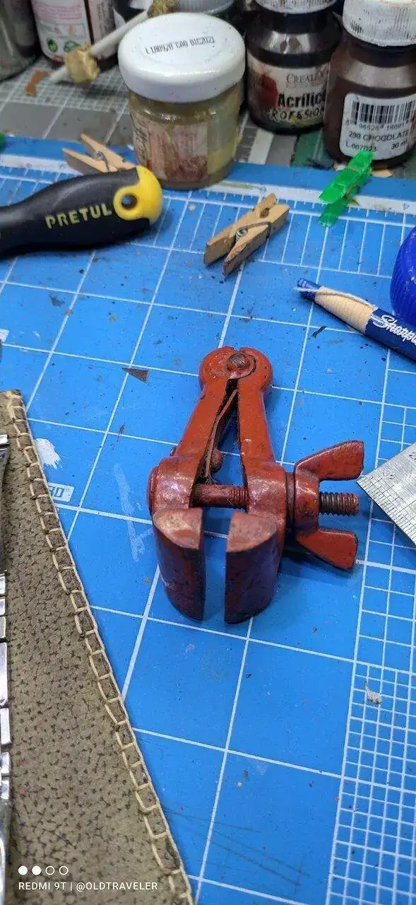 Una prensa manual de joyero, herramienta imprescindible para sujetar los brazaletes o alguna pieza que se quiera manipular, previa proteccion de la pieza (yo uso una pieza de cuero para cubrir la pieza), sujeta firmemente y permite, lijar, doblar, pulir o hacer lo que sea necesario, con esta herramienta, unas espatulas de acero y pinzas de punta fina, pude acortar un brazalete que, un par de relojeros y un artesano del acero rechazaron manipular.