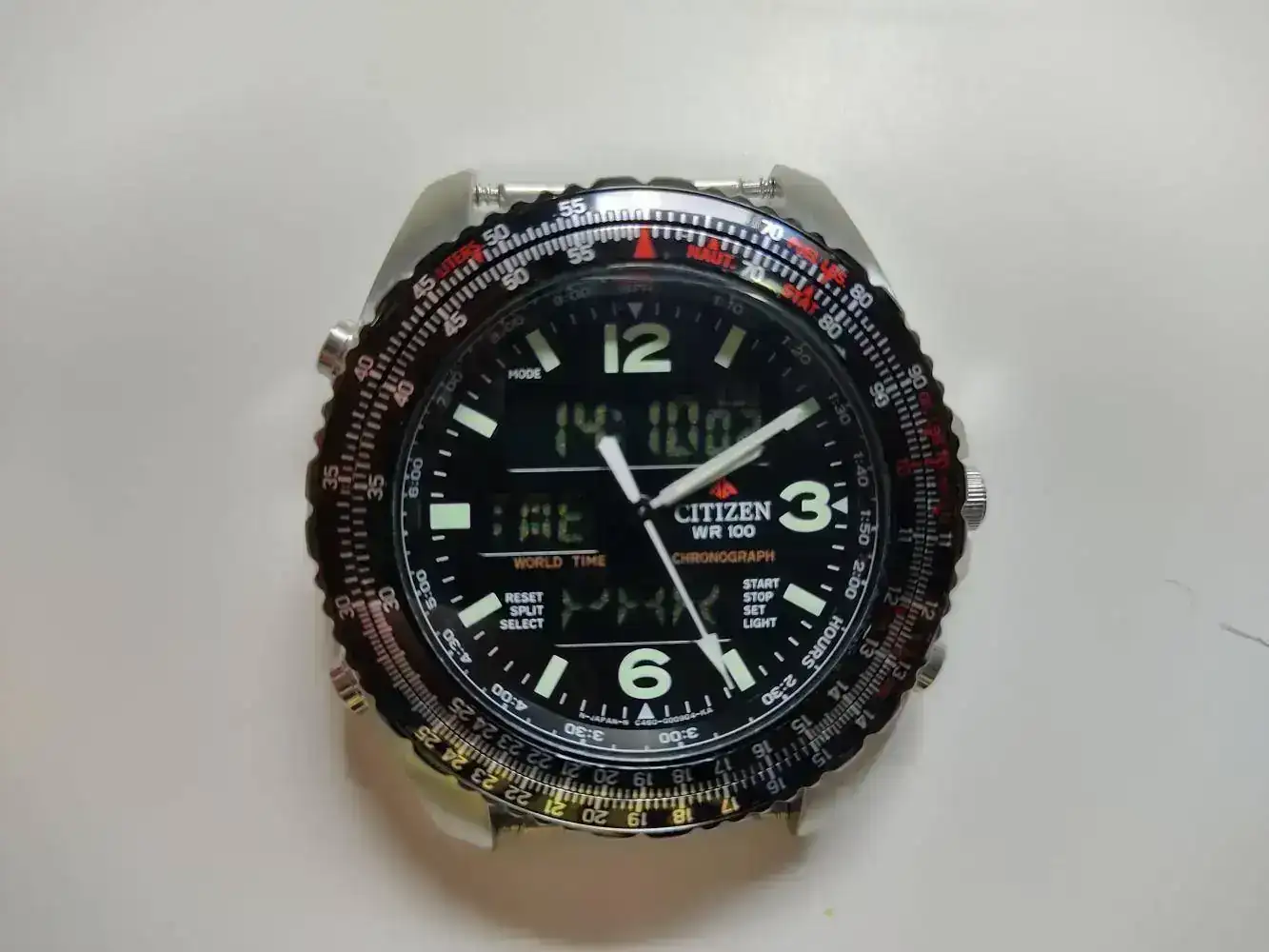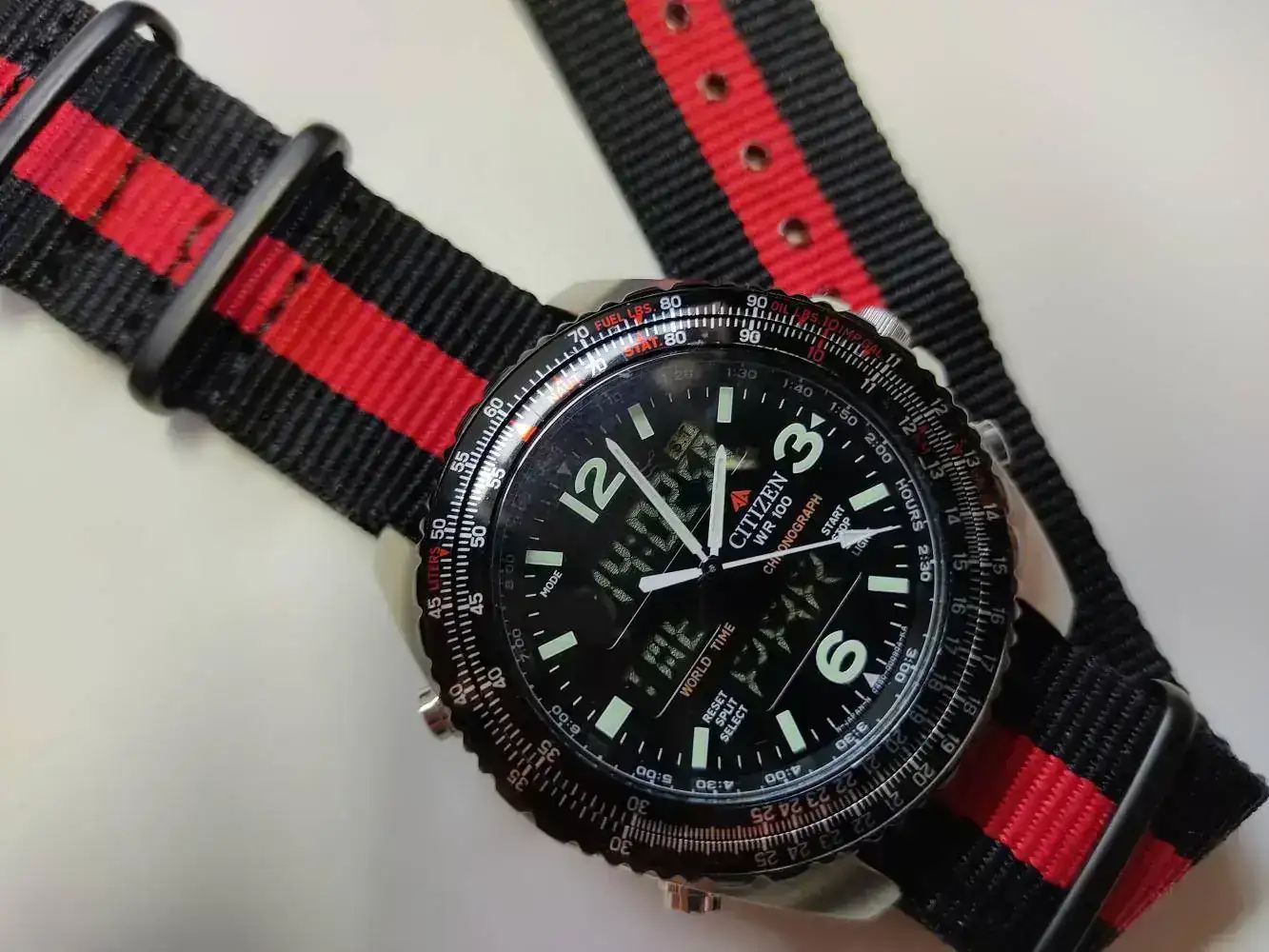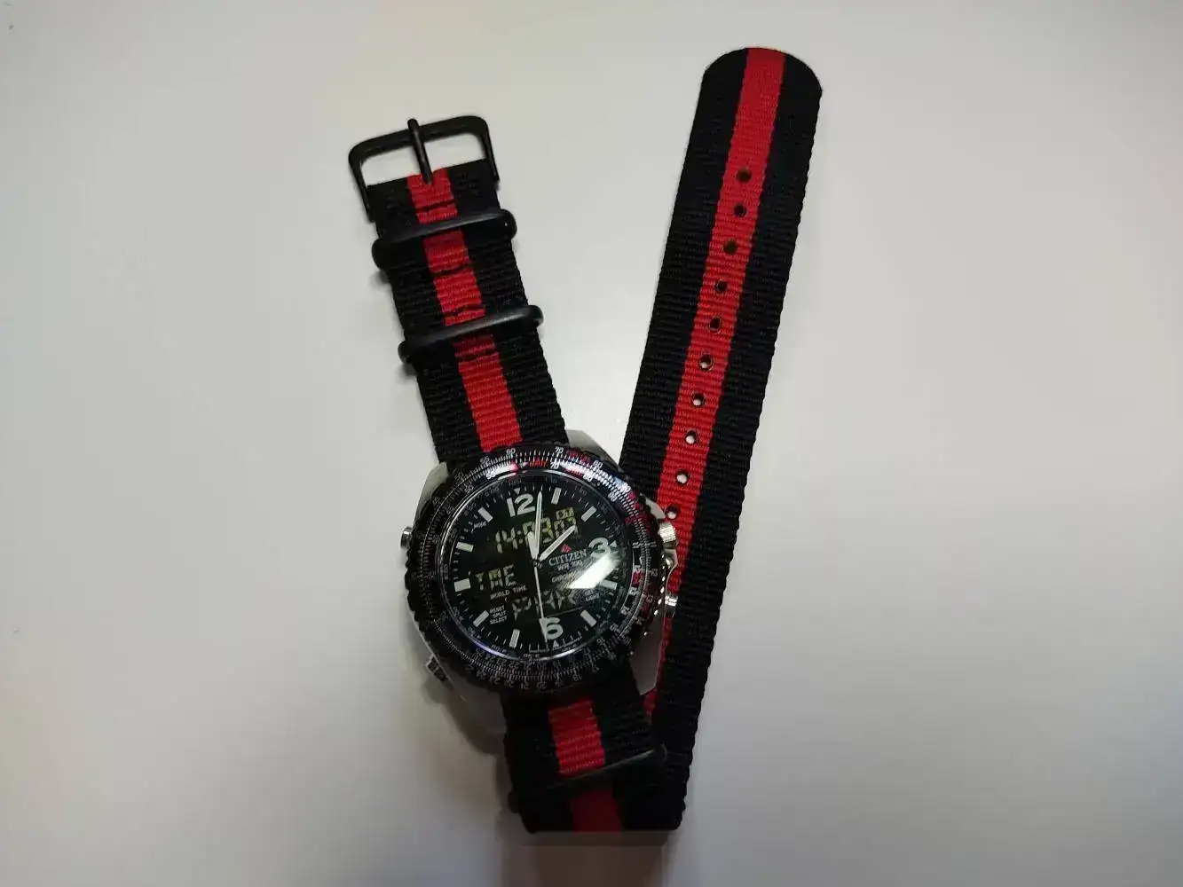 Lo primero fue encontrar el reloj adecuado, y para lo cual me fijé sobretodo en la caja. Los Citizen Promaster parecían perfectos para esto. Al final me decanté or el Wingman Pilots "Cockpit" C460. Lo que me gustó de este reloj es que tenia unos mascadores de horas con lumen, un fondo oscuro y los 3 displays en negativo, lo que hacia un efecto de dial limpio que mantenia la información digital visible pero de sorma discreta para evitar robarle el protagonismo al conjunto.