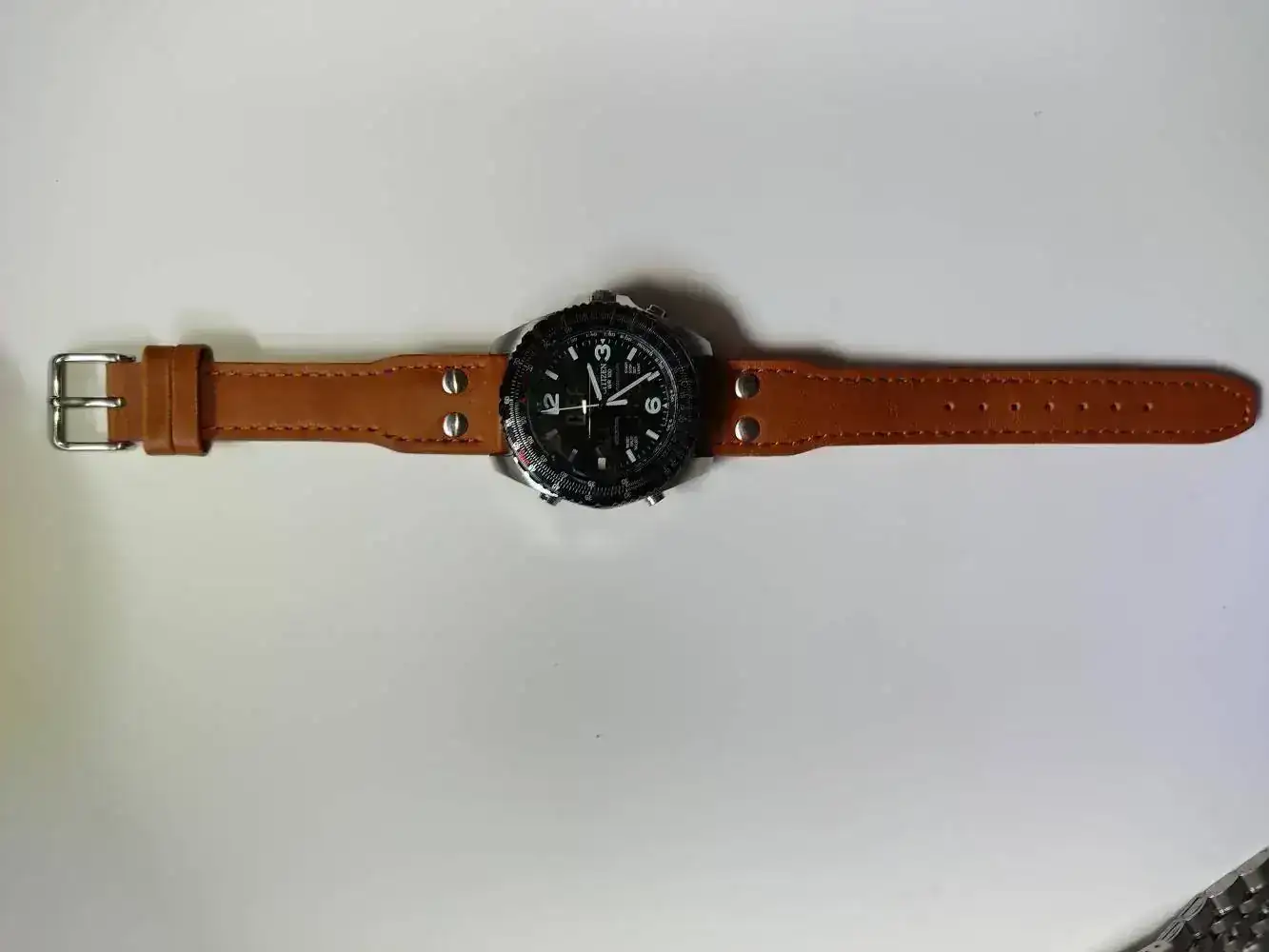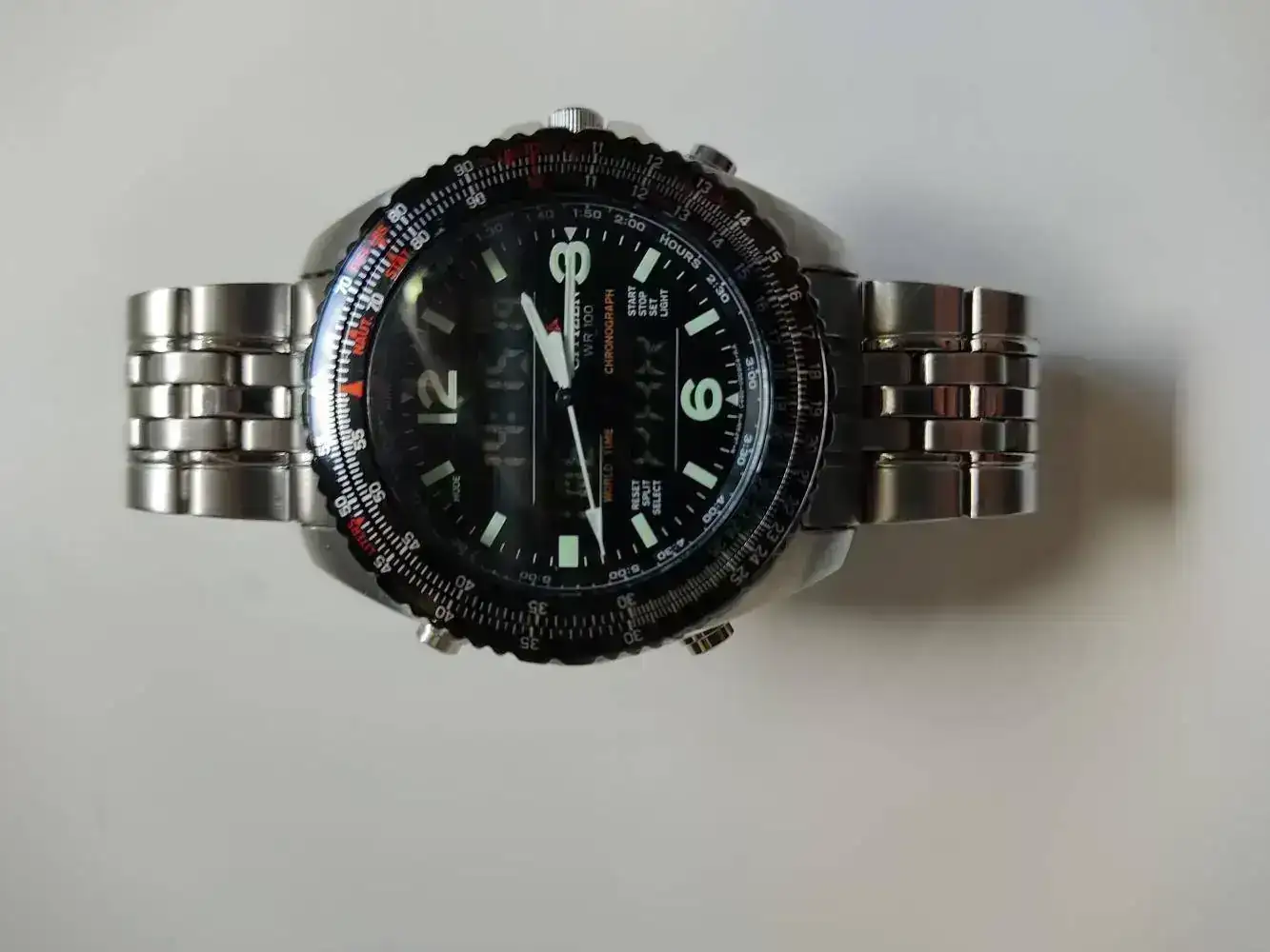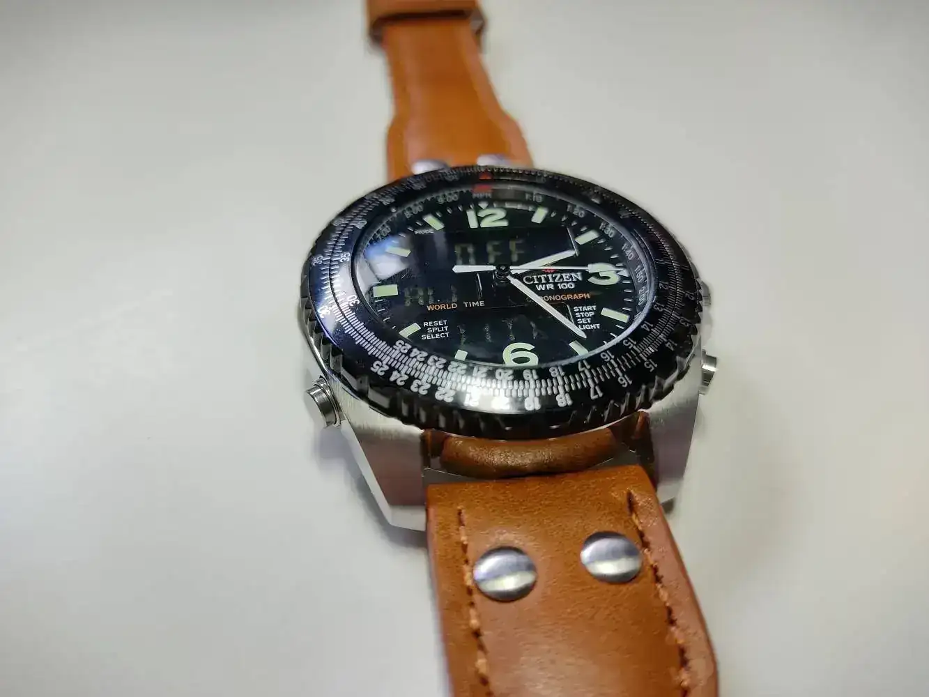 Lo primero fue encontrar el reloj adecuado, y para lo cual me fijé sobretodo en la caja. Los Citizen Promaster parecían perfectos para esto. Al final me decanté or el Wingman Pilots "Cockpit" C460. Lo que me gustó de este reloj es que tenia unos mascadores de horas con lumen, un fondo oscuro y los 3 displays en negativo, lo que hacia un efecto de dial limpio que mantenia la información digital visible pero de sorma discreta para evitar robarle el protagonismo al conjunto.