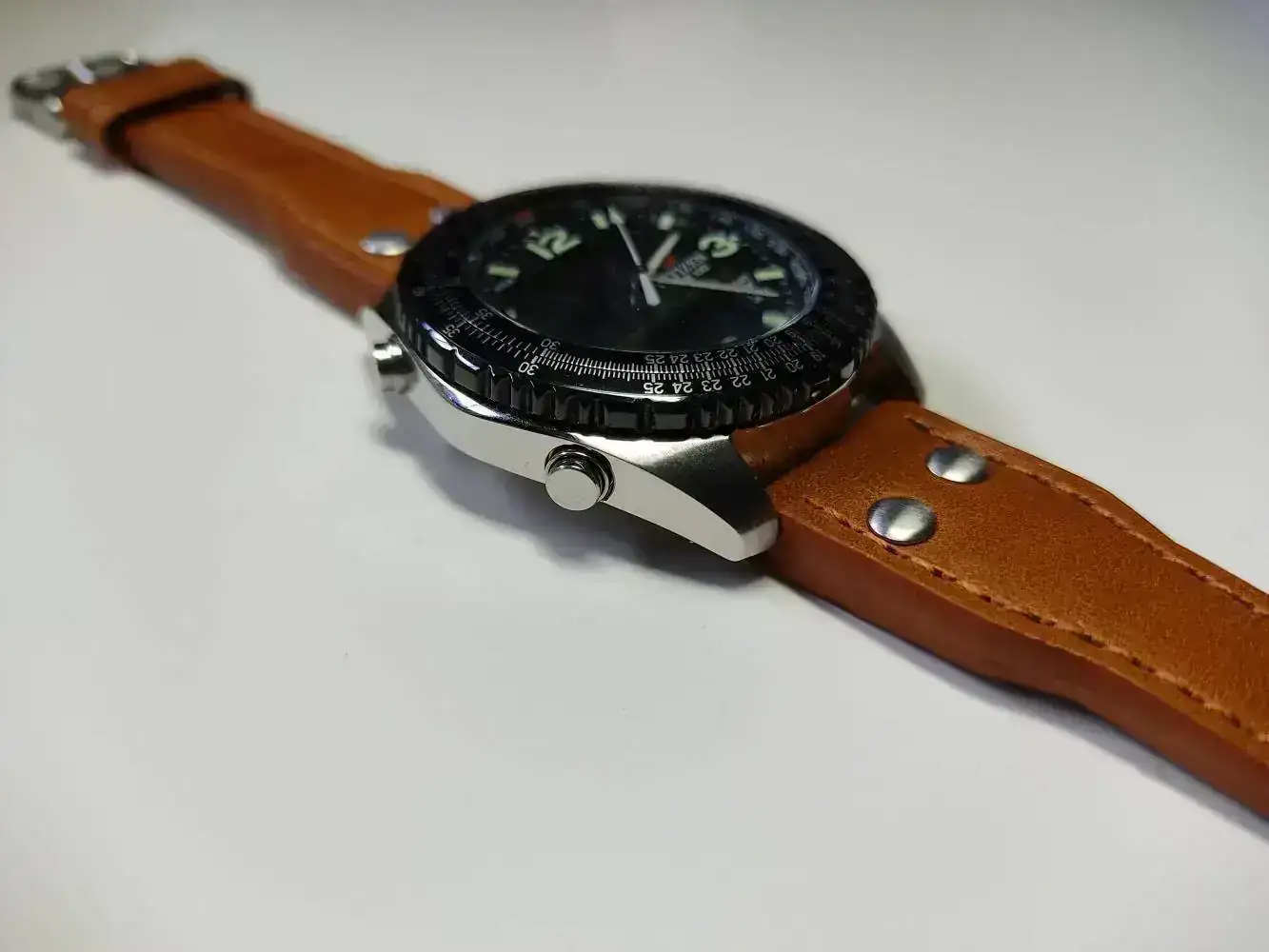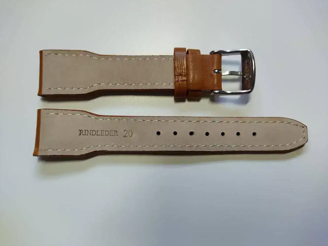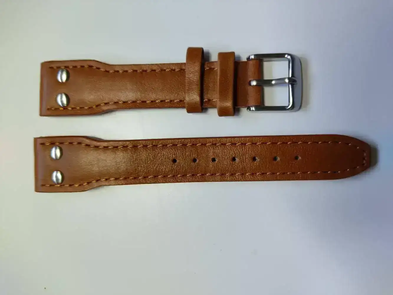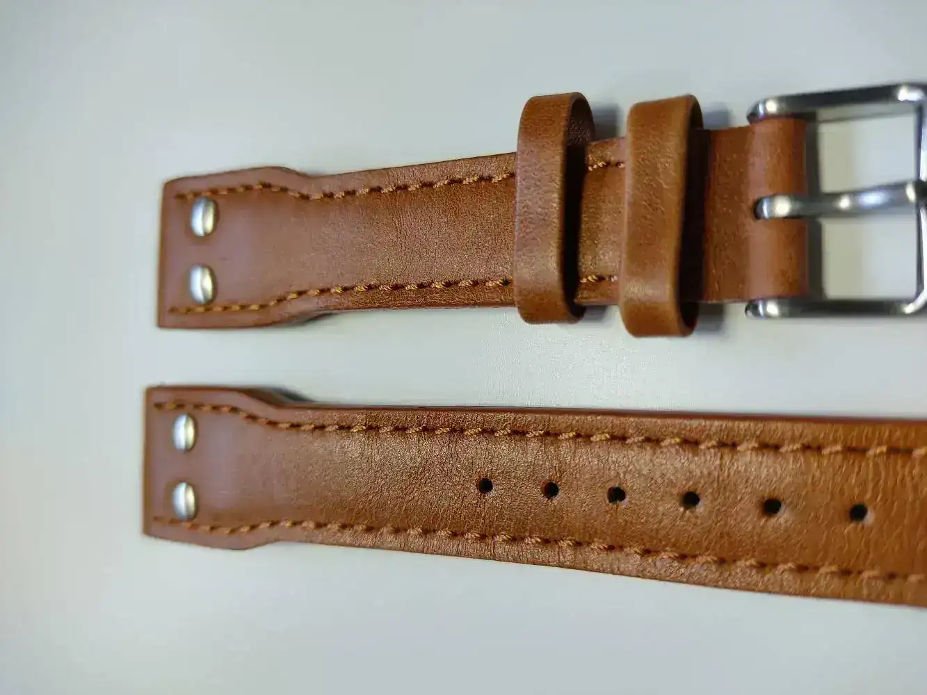 Para que el conjunto tuviera una apariencia de flieger le compré una correa clásica de cuero marrón camel con remaches comprada en la tienda alemana Watchband Berlin. Este es el link de compra: https://www.correa-para-reloj.eu/navi.php?a=19031 Dejo algunas fotos de la correa: