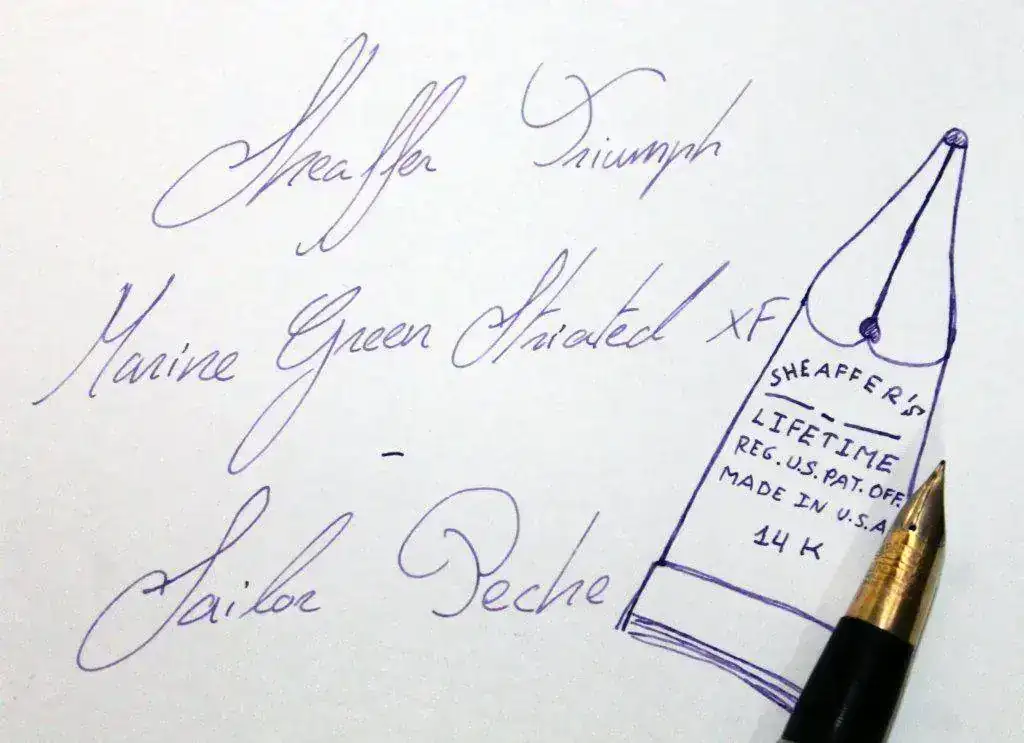 Cuando terminó con los otros clientes me tocó a mí, después de haber estado mirando las Pelikan me sacó las Sheaffer y mientras veía esos estriados tan bonitos me acordé de los plumines triumph y me enseño varias con ese plumín, recuerdo 3, dos en verde y una en rojo. Las sostuve, me gustó mucho su peso y su tacto, por no hablar de ese plumín tan bonito. Como quería ver algunas más las dejé un momento a un lado, pero ese plumín seguía en mi cabeza.
